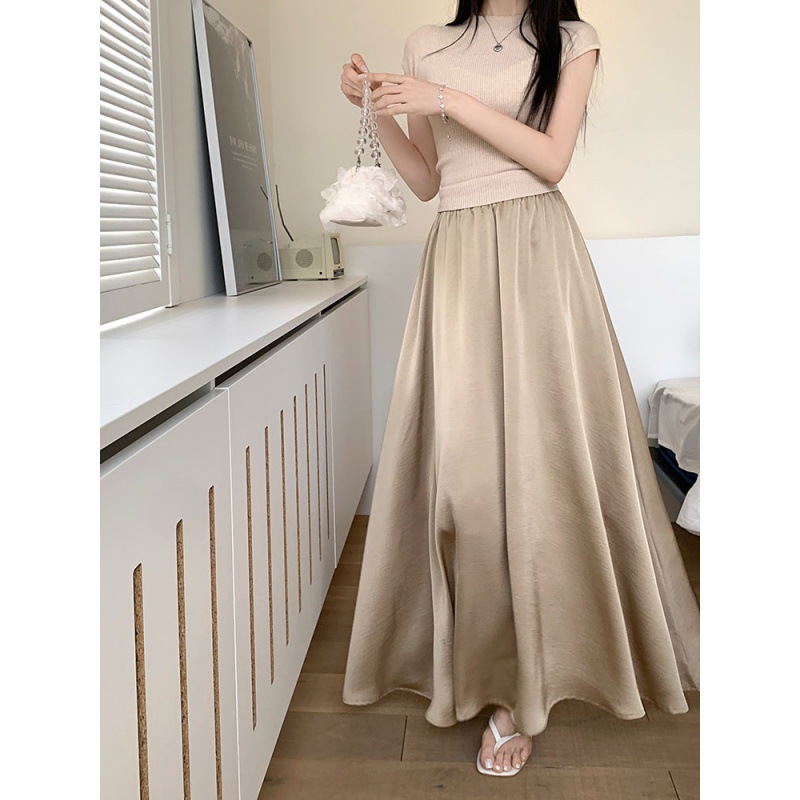 新款潮韩系缎面大摆长裙松紧腰显瘦A字垂坠感半身裙