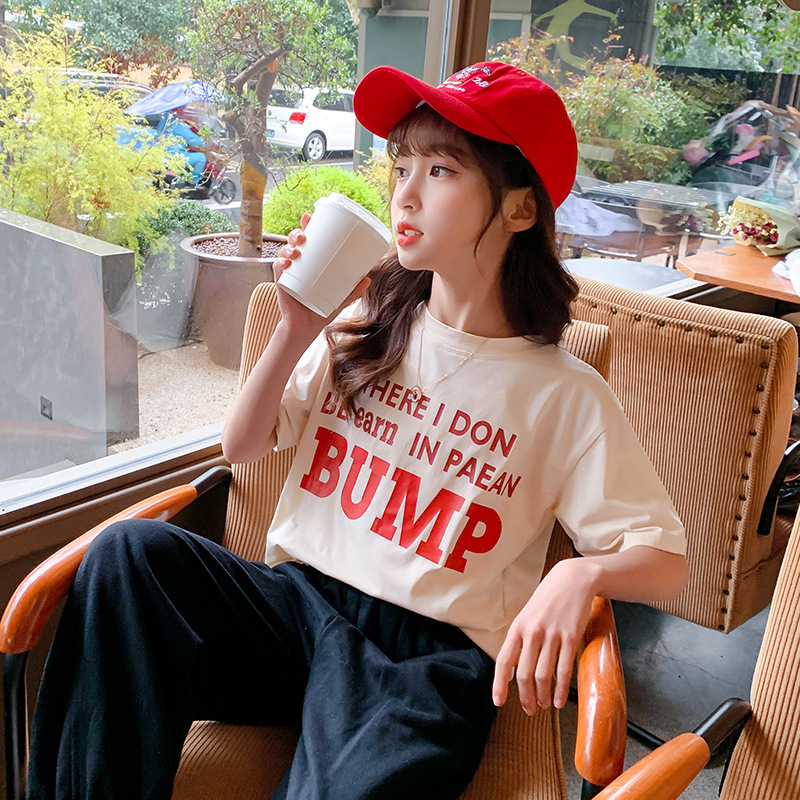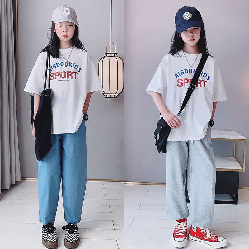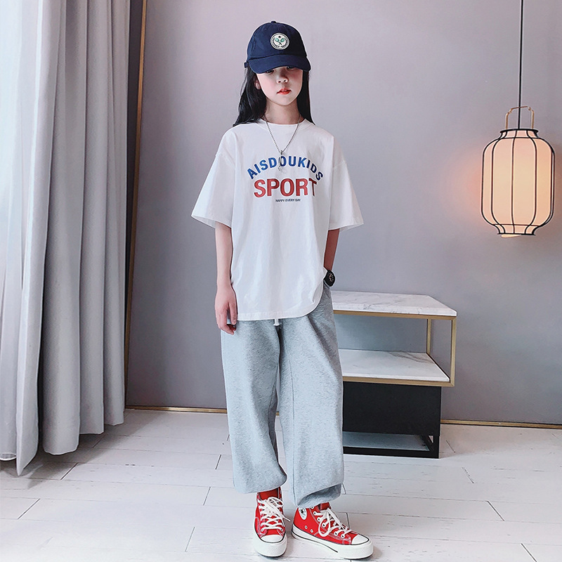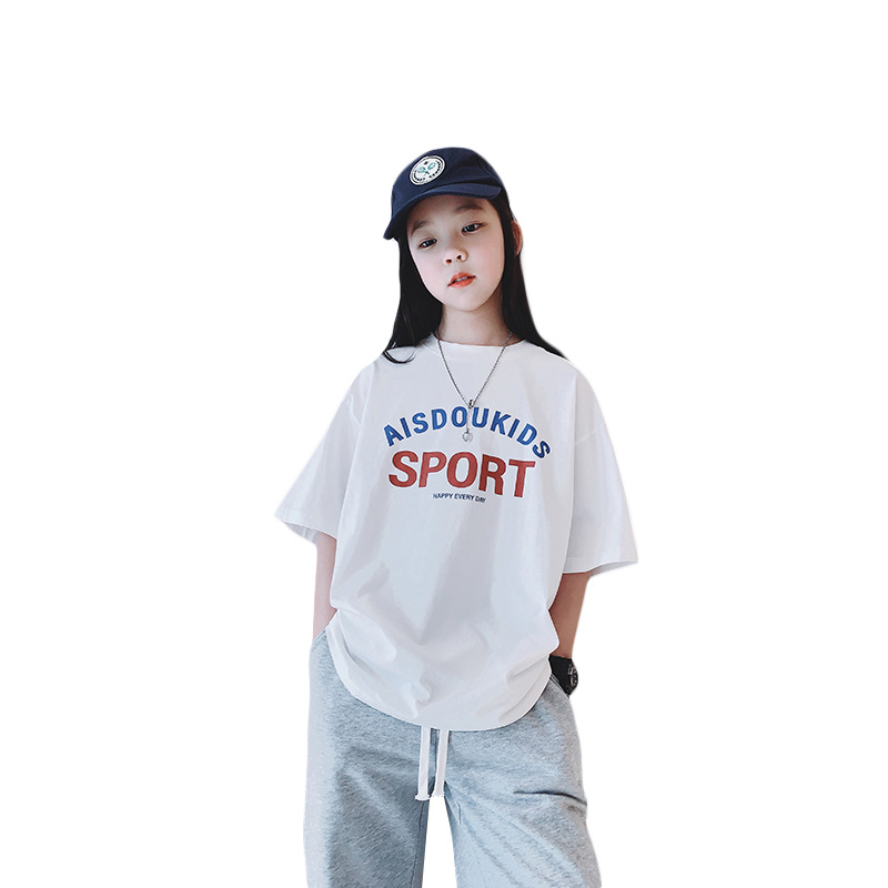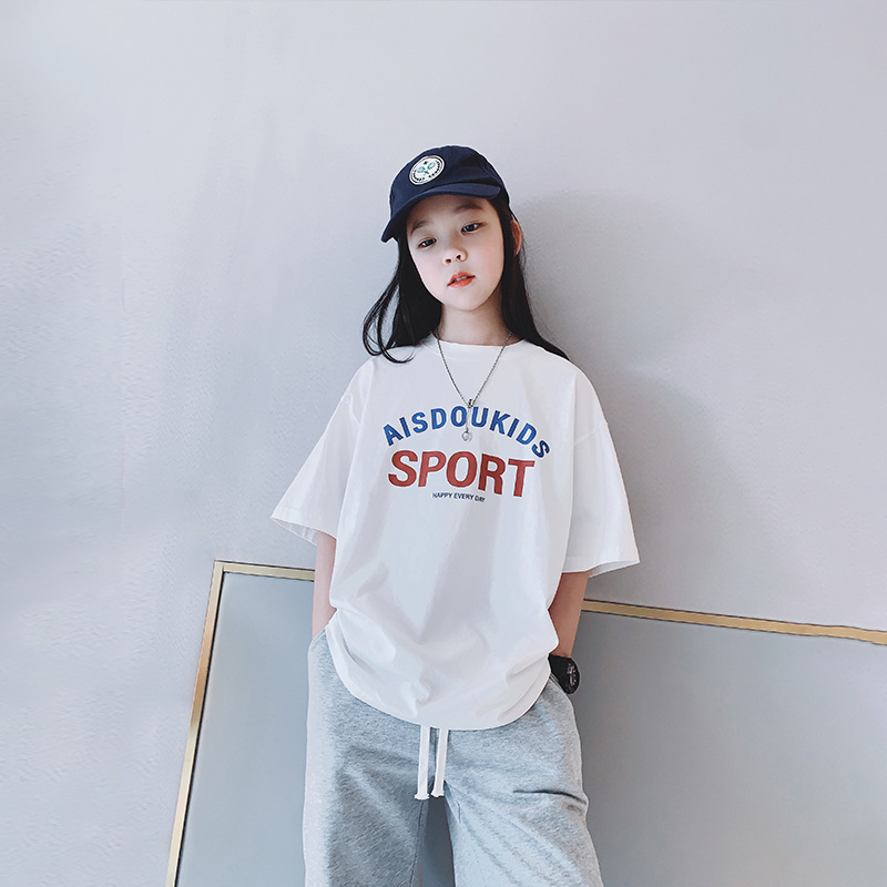 女童短袖纯棉t恤字母印花圆领休闲中大童女孩宽松上衣夏季童装