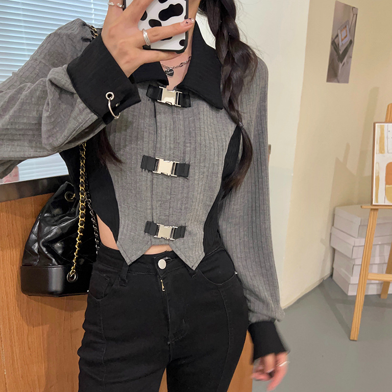 韩版春秋新款辣妹设计感不规则华夫格长袖外套女遮肉显瘦短款上衣