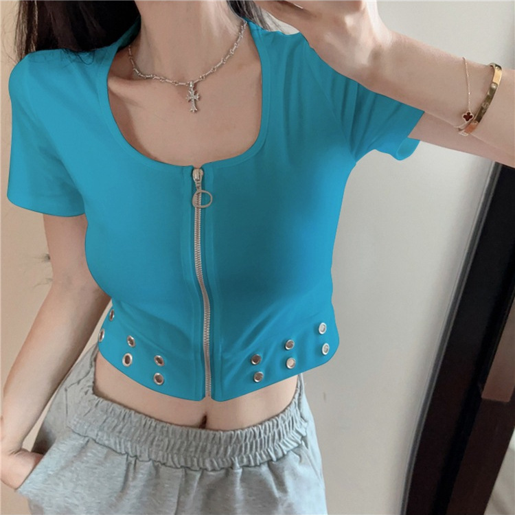 纯棉甜辣风纯欲设计感小众洋气拉链修身高腰露脐别致短款上衣欧货
