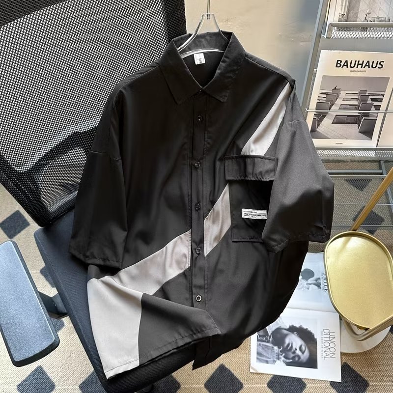 男士短袖衬衫潮流拼接工装外套夏季韩版青少年帅气休闲衬衣男装潮