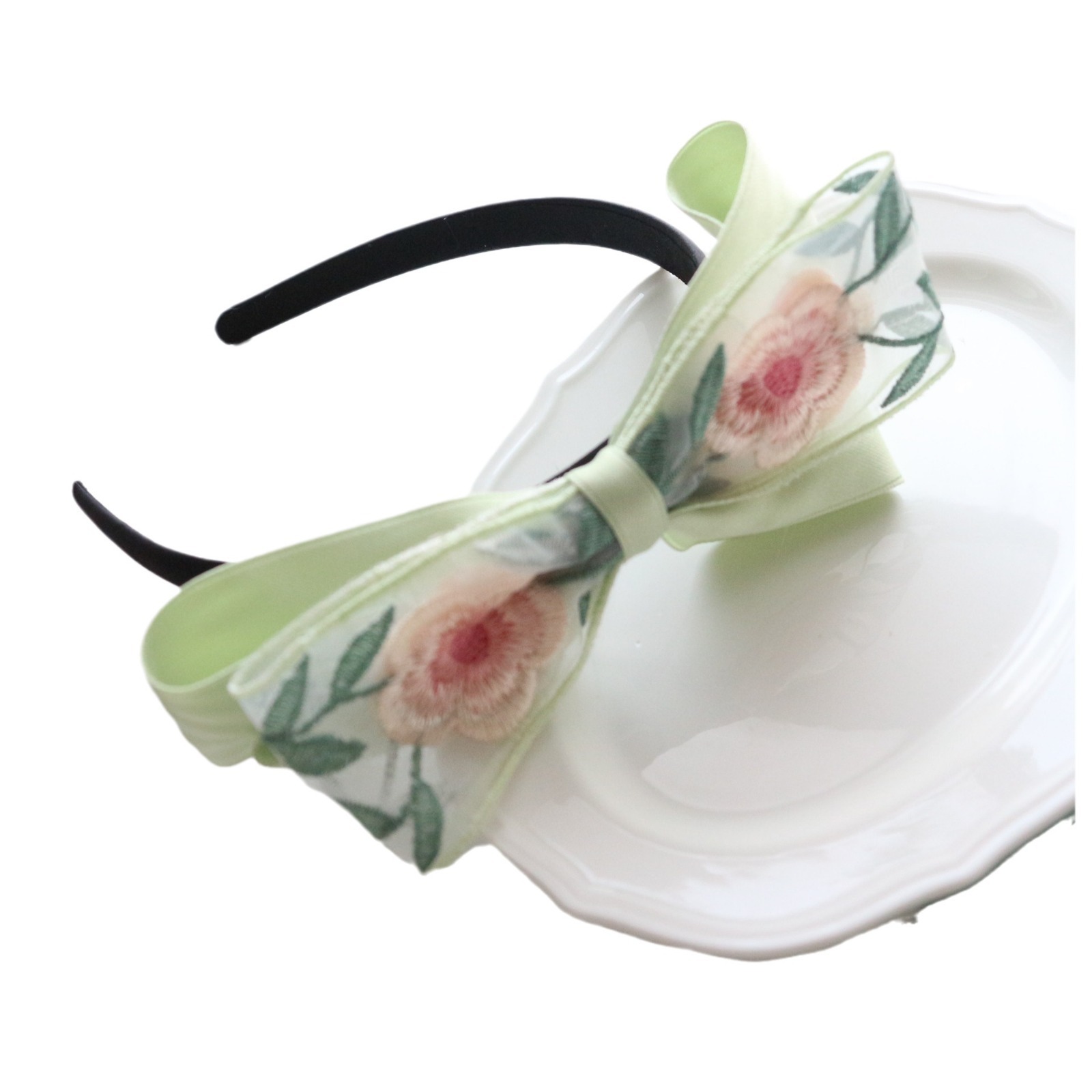 网纱刺绣发箍-粉绿