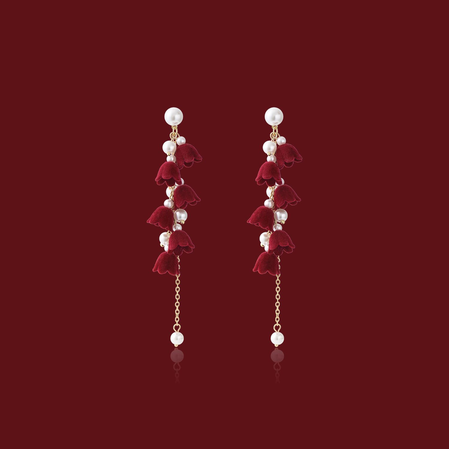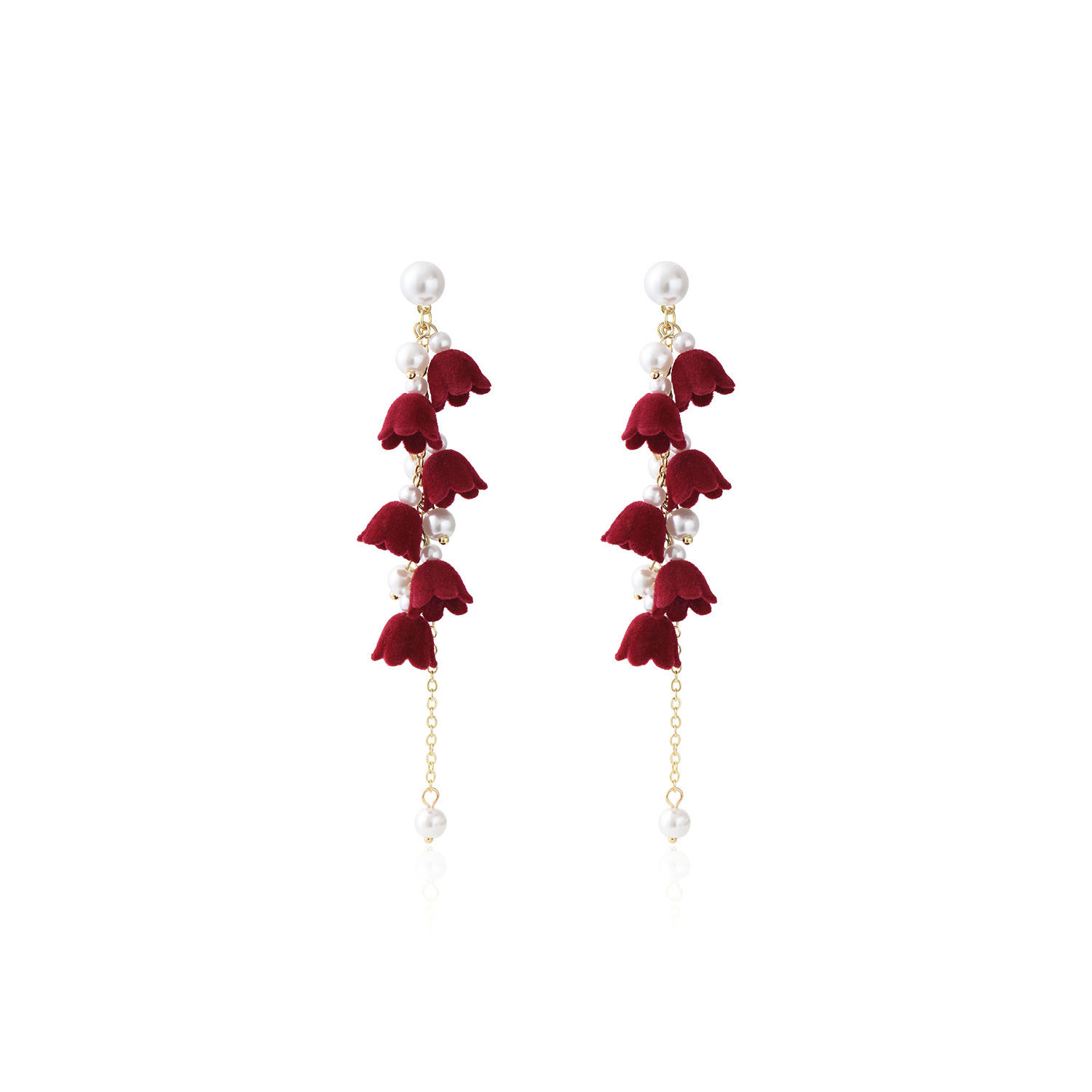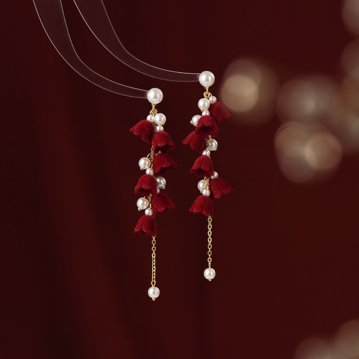 新年元旦红色耳饰一串植绒风铃花朵耳钉过年结婚流苏高级感耳环女