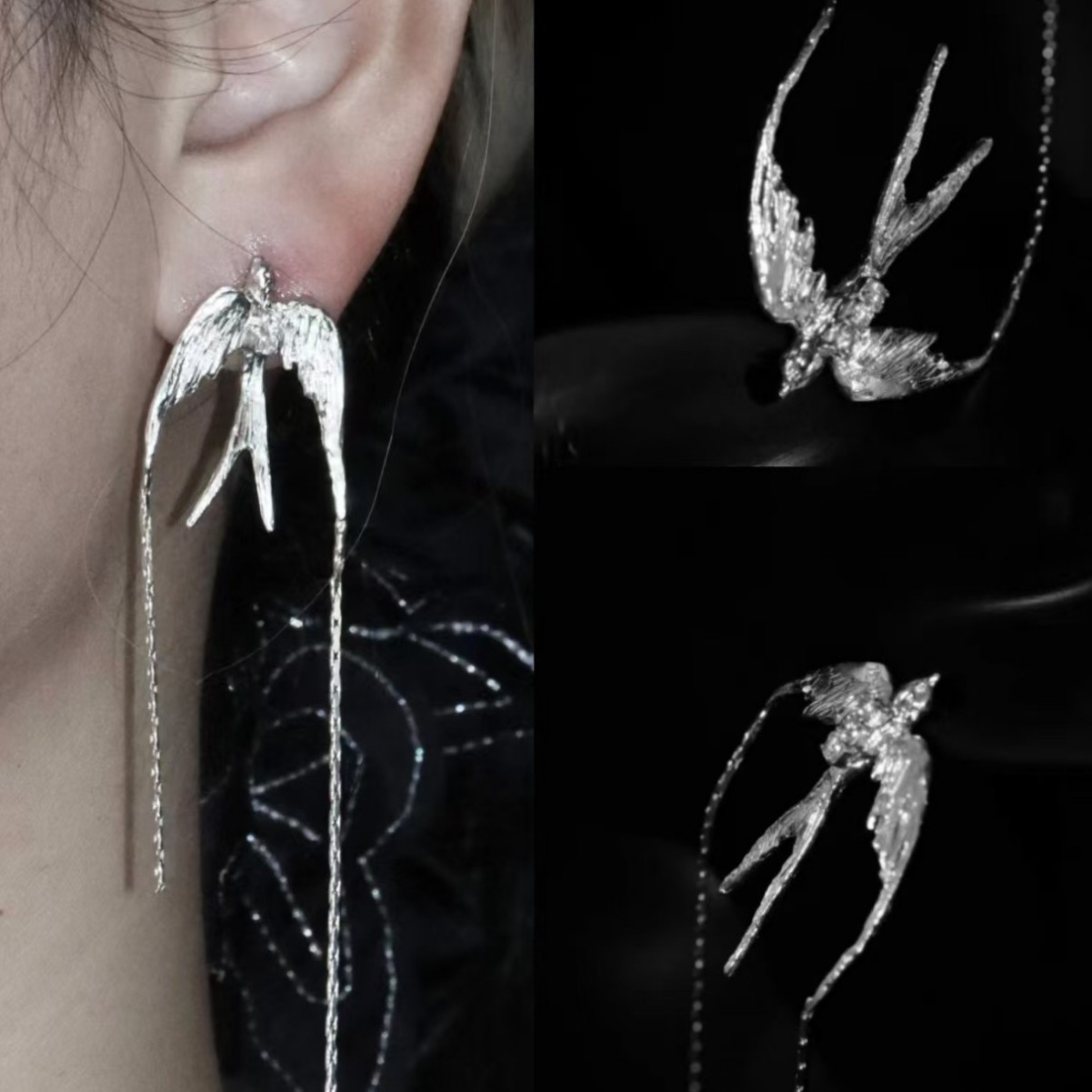 超仙冷淡设计银色燕子耳钉高级精灵耳环链条飞鸟翅膀流苏耳环耳饰