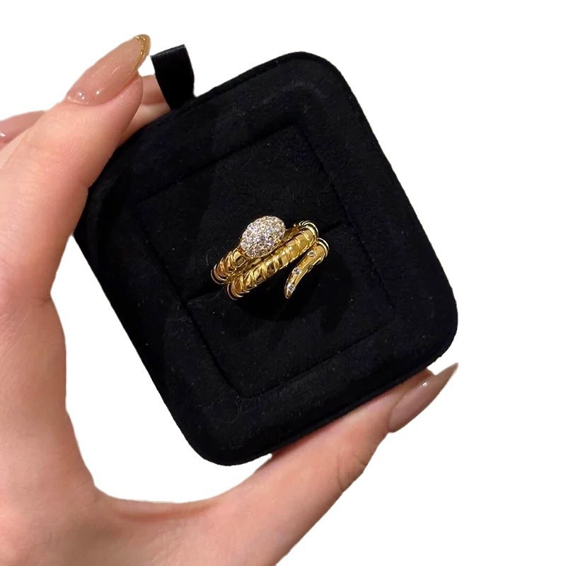 中古爆闪满钻蛇头缠绕灵蛇戒指简约个性复古本命年多圈金色食指戒