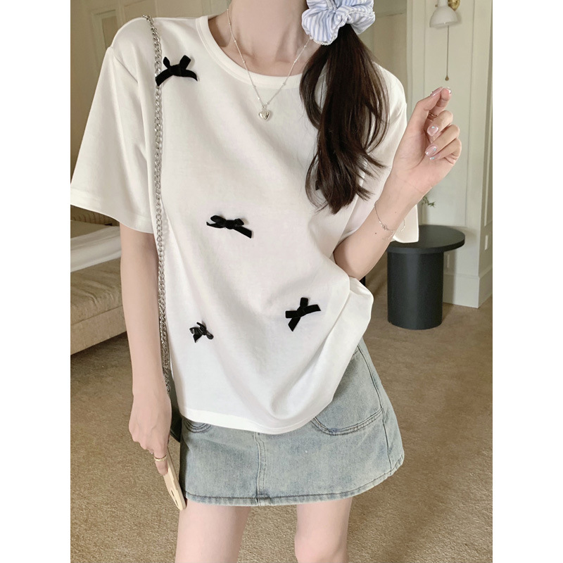 蝴蝶结短袖正肩T恤夏季大码宽松纯棉百搭甜辣上衣女法式体恤
