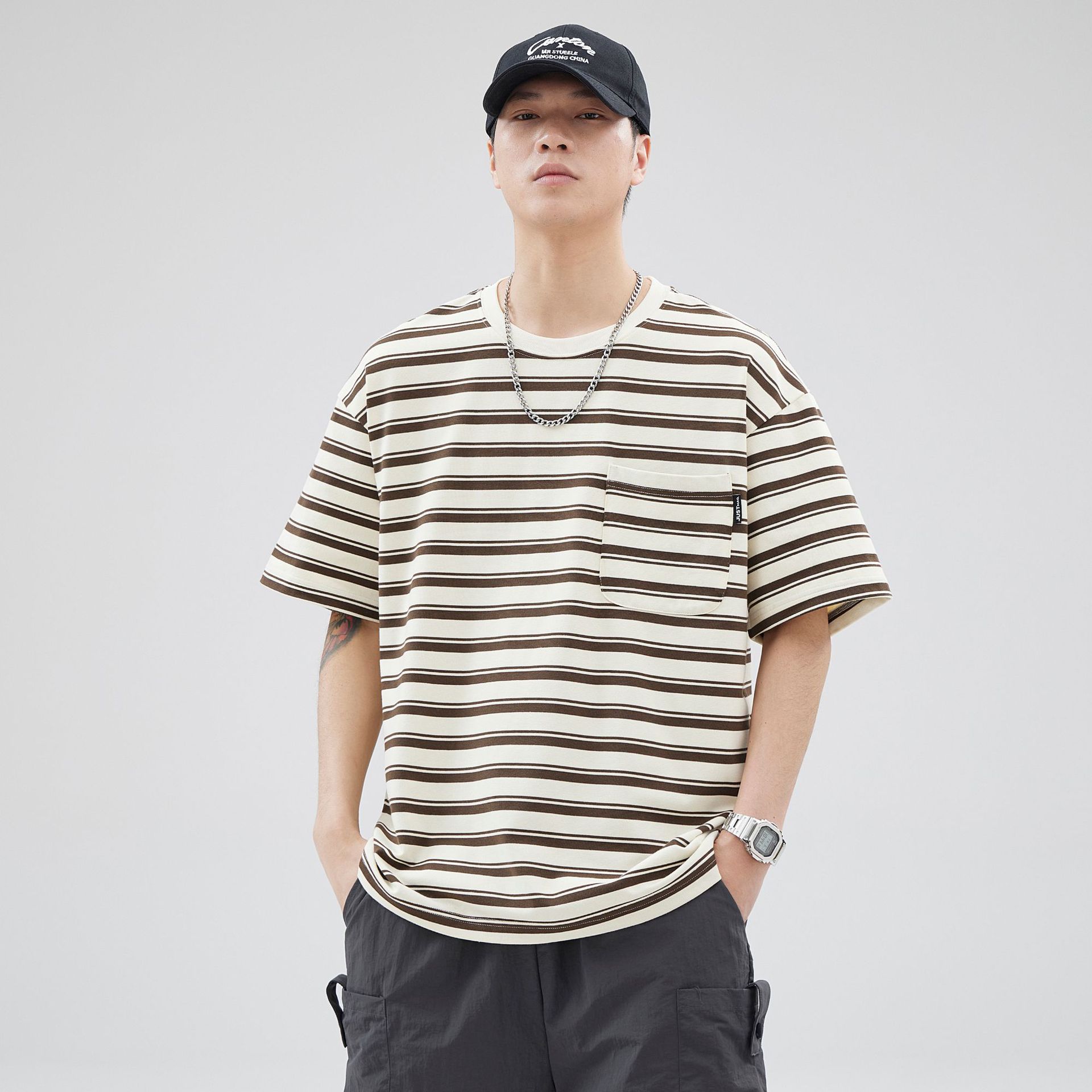 250g条纹短袖t恤男士夏季宽松大码半袖潮牌新款重磅拼色上衣