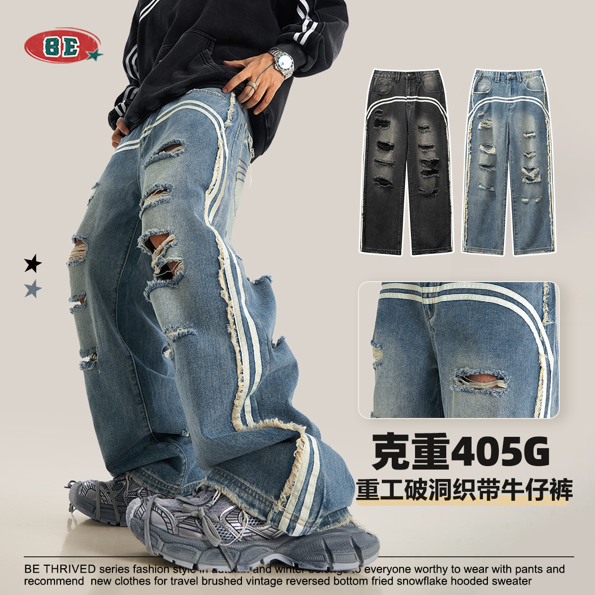BE男装四季款美式复古潮流高街做旧痞帅宽松阔腿拖地牛仔裤男