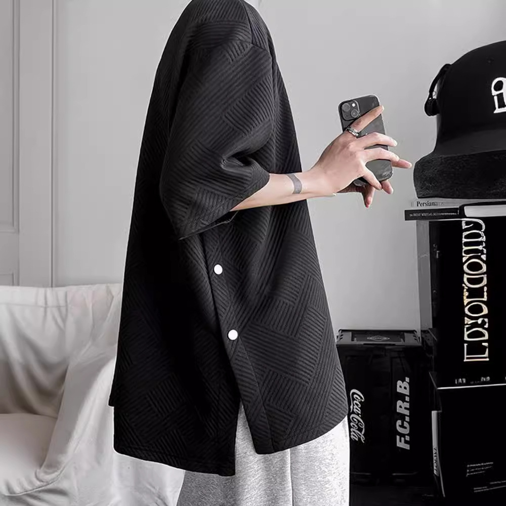 冰丝短袖男春季潮牌凉感宽松肌理感t恤ins设计感小众简约排扣半袖