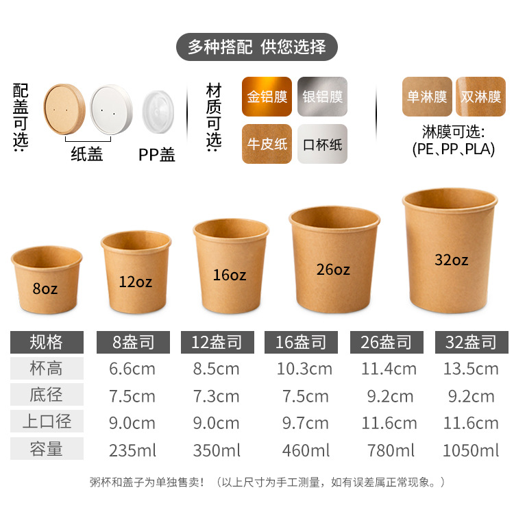- 26盎司;牛皮纸汤桶-双PE淋膜-盖另拍