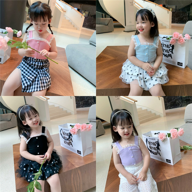 夏季女童背心吊带宝宝网红洋气儿童个性潮牌韩版珍珠蕾丝花边上衣