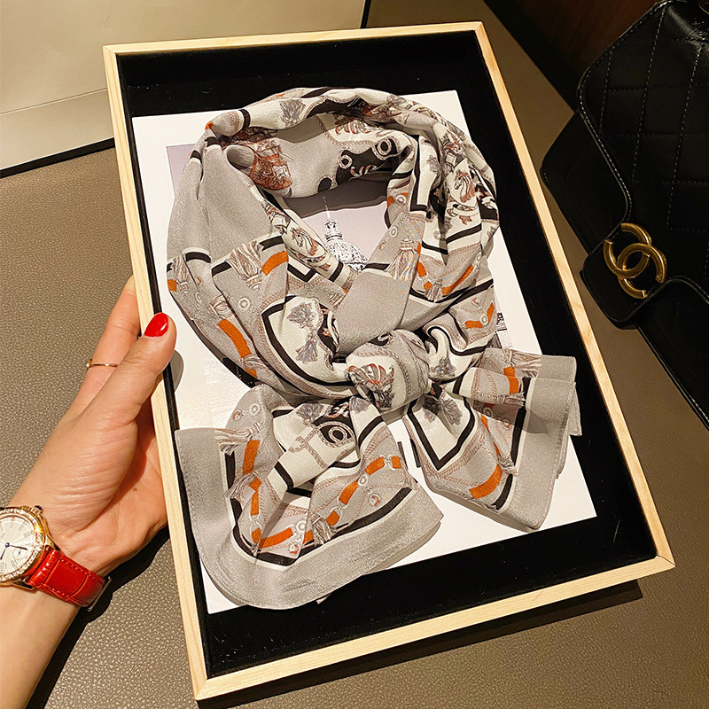 日韩甜美骏马链条真丝围巾100%桑蚕丝长条飘带双面领巾百搭丝巾