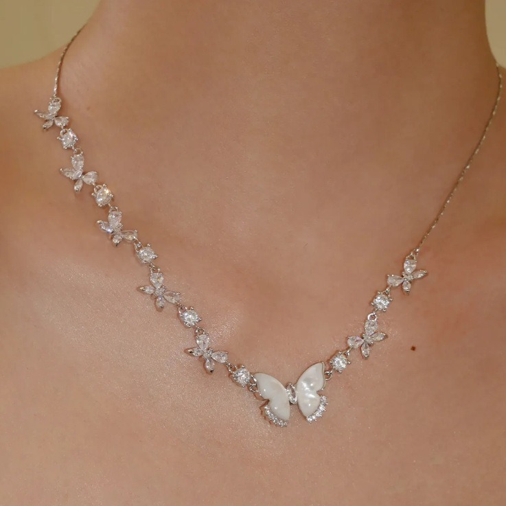 小香风白贝母锆石蝴蝶吊坠项链轻奢时尚高级感锁骨链小众通勤颈链