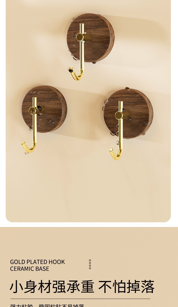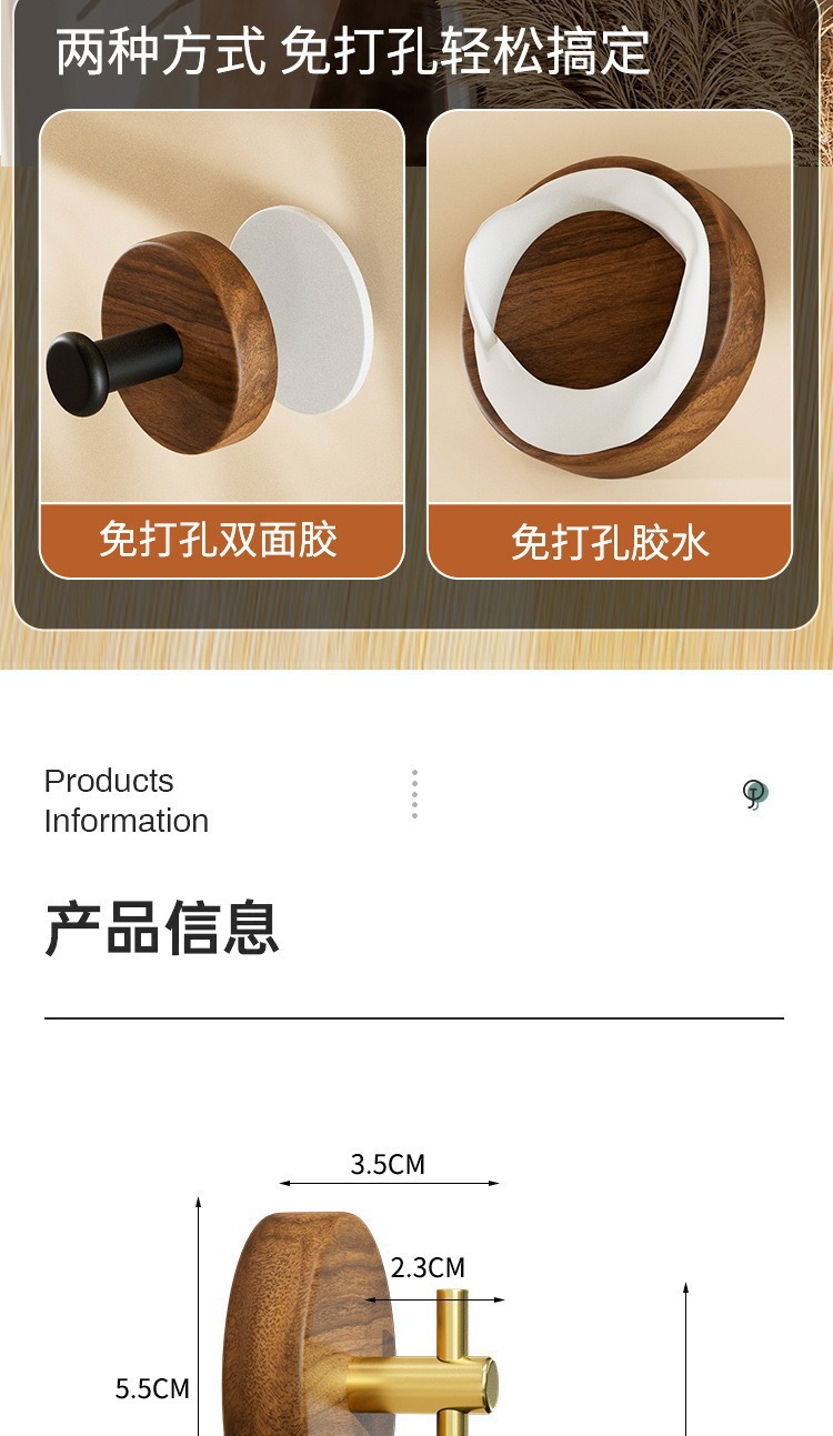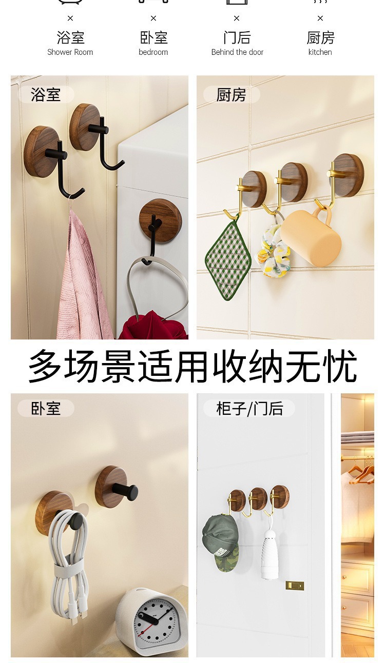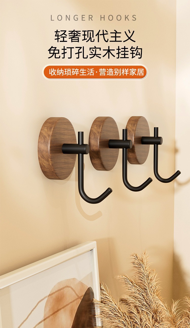 北欧实木挂衣钩胡桃木门后墙面挂钩免打孔衣钩高颜值粘胶挂衣架子