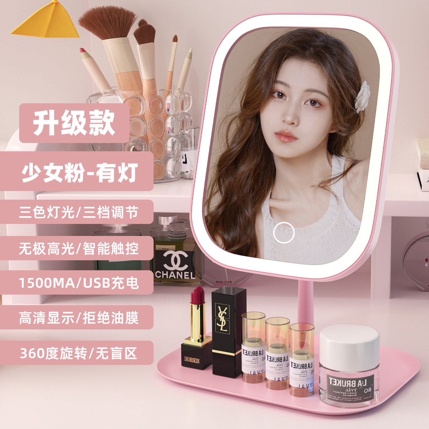 led三色化妆镜带灯女生卧室梳妆台学生宿舍桌面补光小镜子