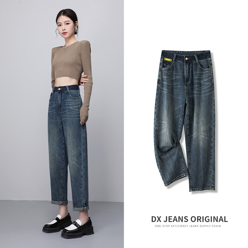 哈伦牛仔裤女宽松显瘦秋款高级感撞色遮胯高腰老爹萝卜长裤