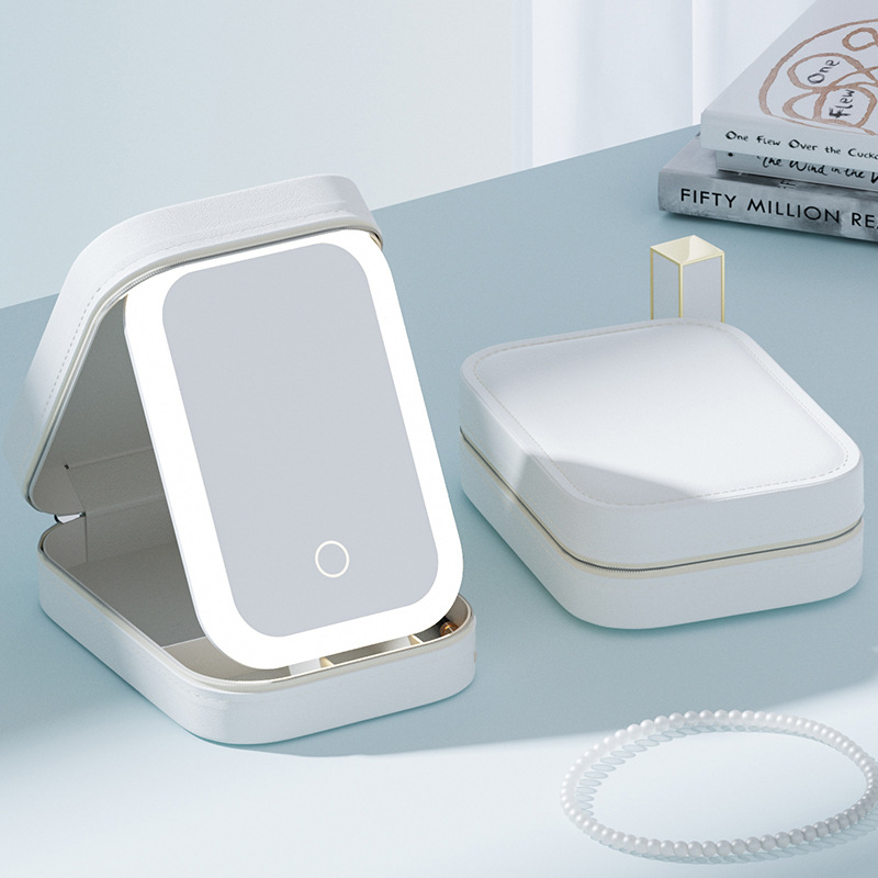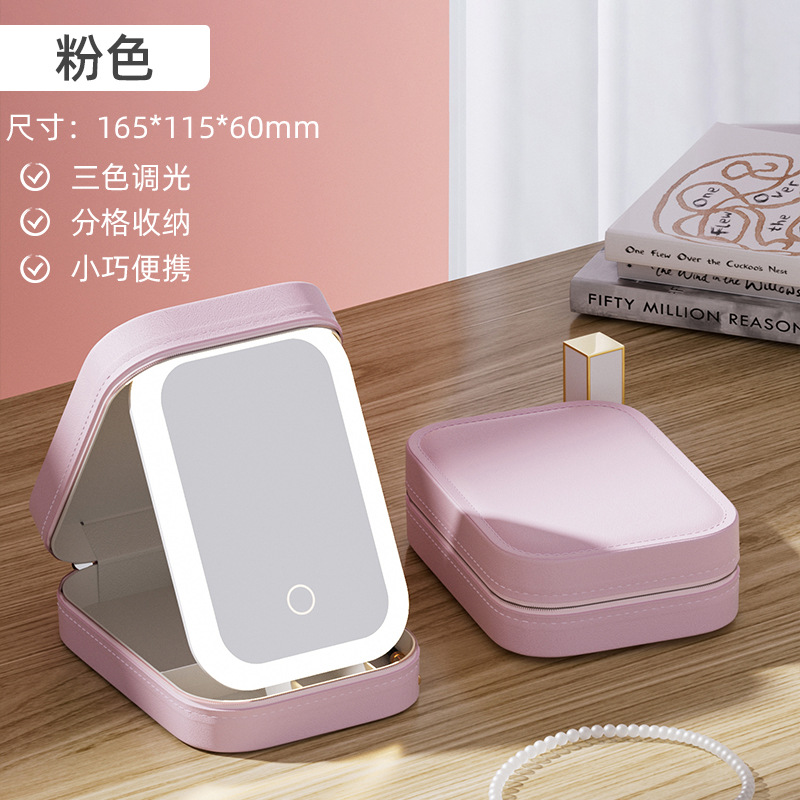 跨境多功能带灯镜子收纳盒双层便携女家用宿舍首饰盒子折叠收纳包