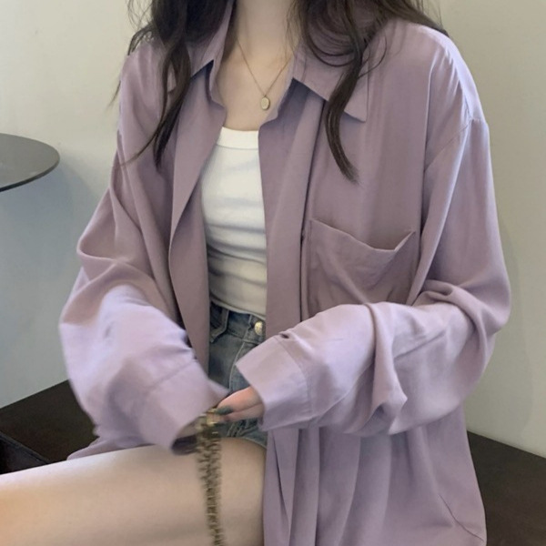 法式紫色防晒衬衫春秋宽松小众设计感长袖女薄款百搭衬衣