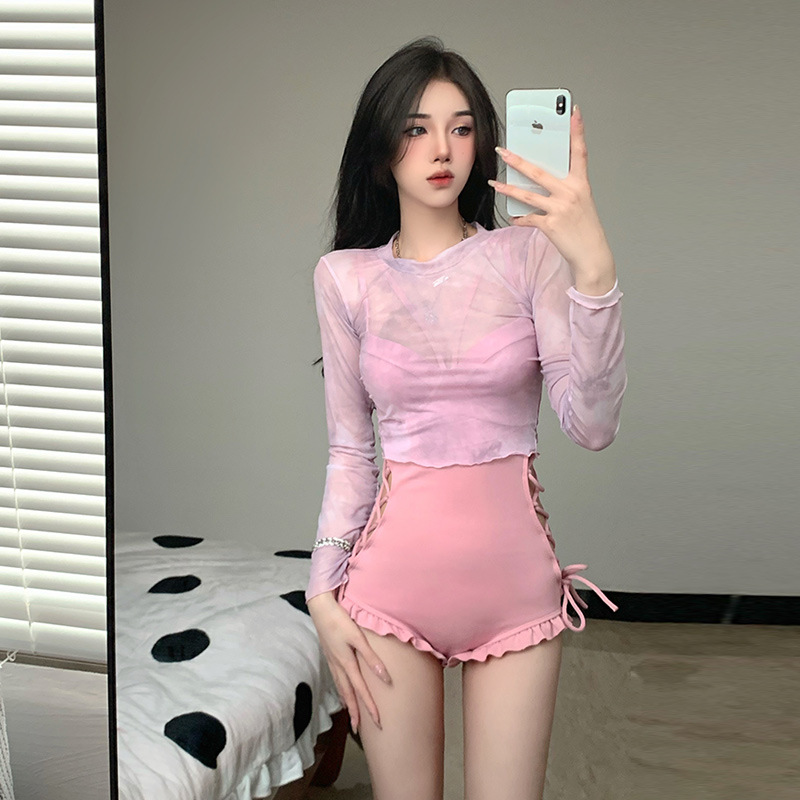 夏季新款女士连体泳衣粉色泳衣小清新遮肚显瘦温泉度假游泳衣