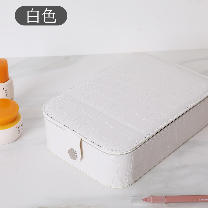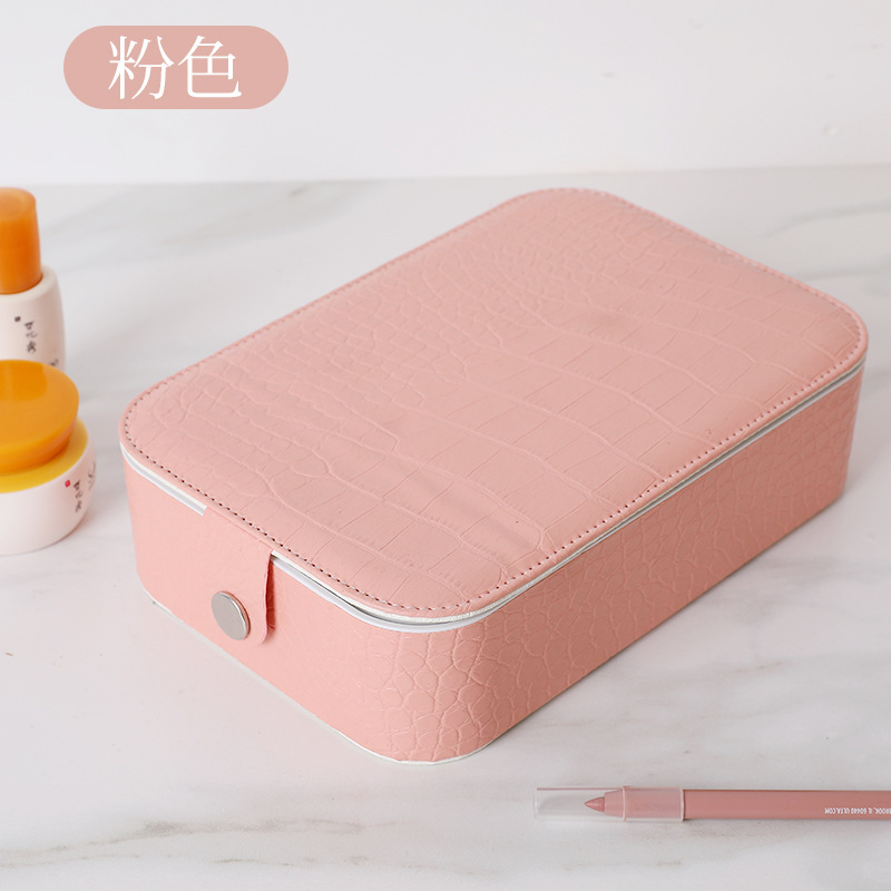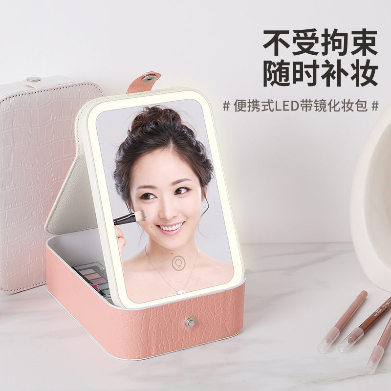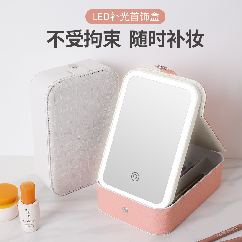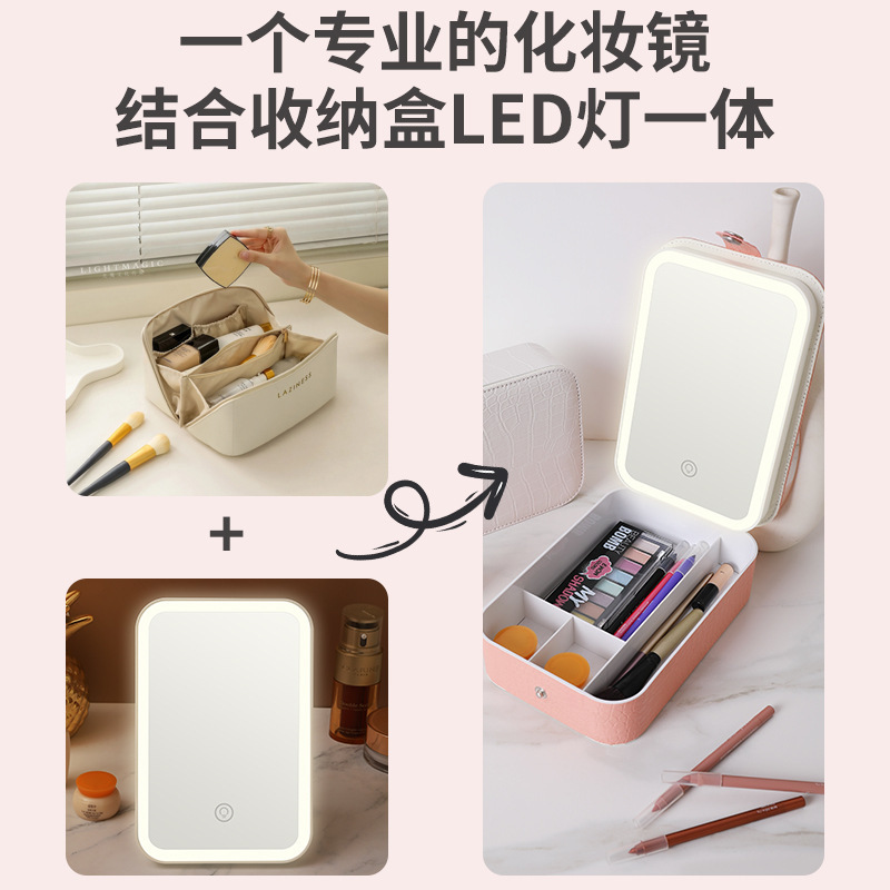 网红便携收纳镜带灯LED补光镜面梳妆收纳盒一体按扣镜三色文具盒