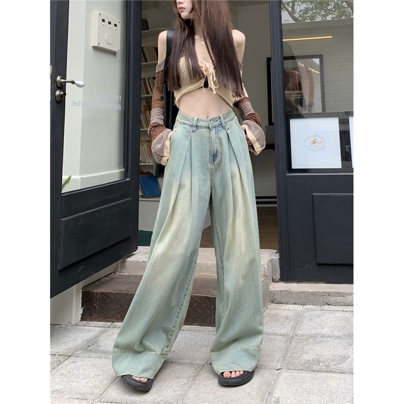 夏季新款慵懒风垂坠感复古怀旧辣妹高腰宽松拖地牛仔长裤女