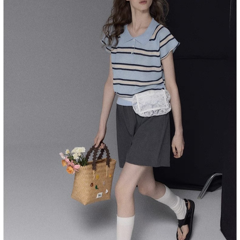 航海风插肩袖蓝色条纹针织T恤女夏季新款通勤简约百搭上衣