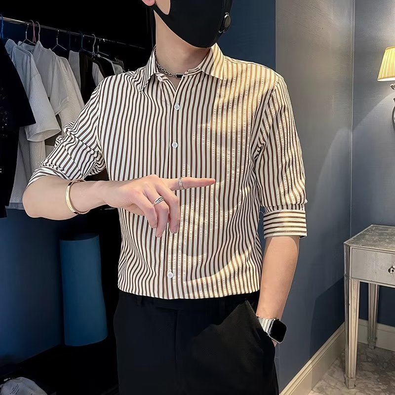 条纹七分袖衬衫男 设计感痞帅潮牌短袖寸衫休闲夏季冰丝7分袖衬衣