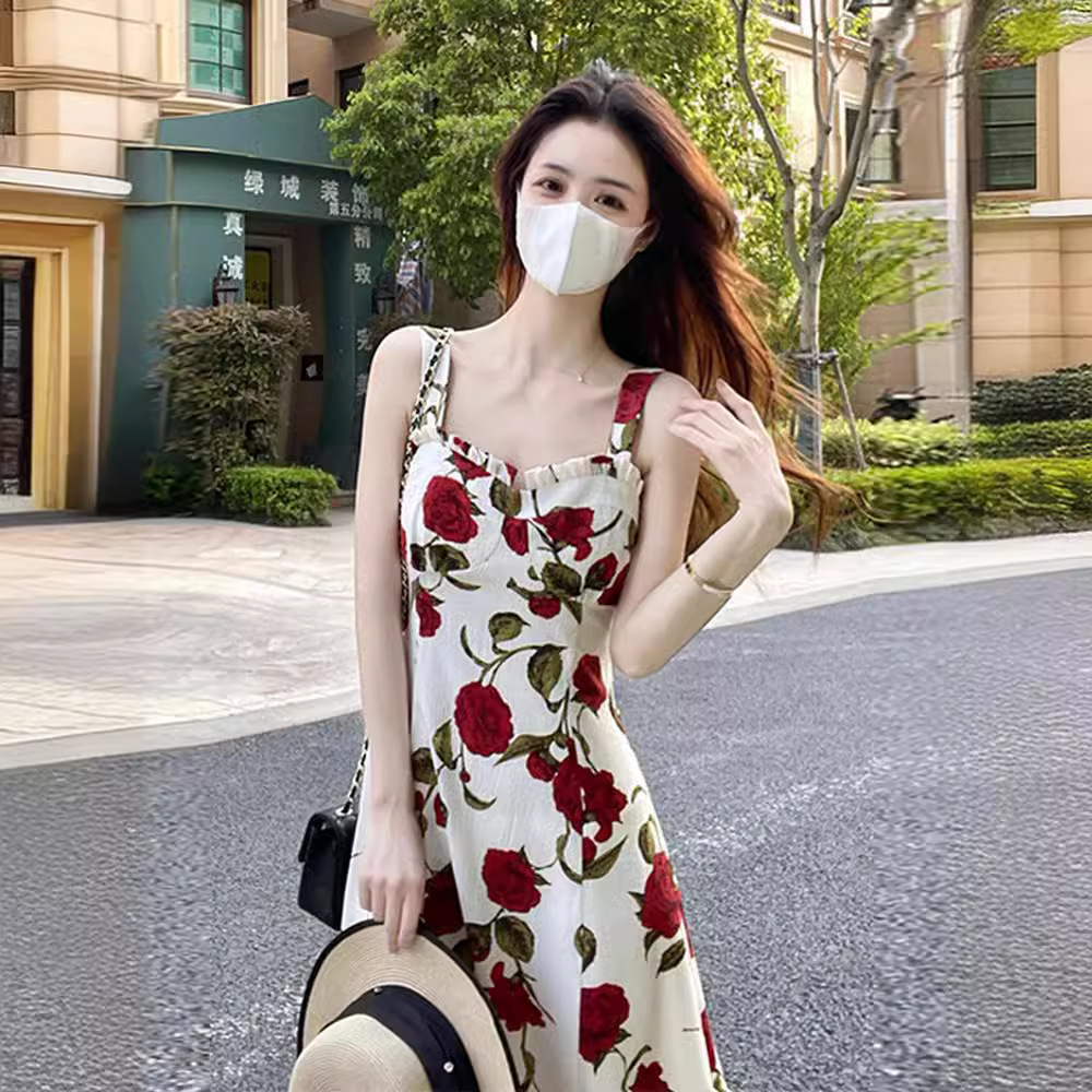 女神范性感吊带长裙季新款可盐可甜茶歇玫瑰碎花气质连衣裙