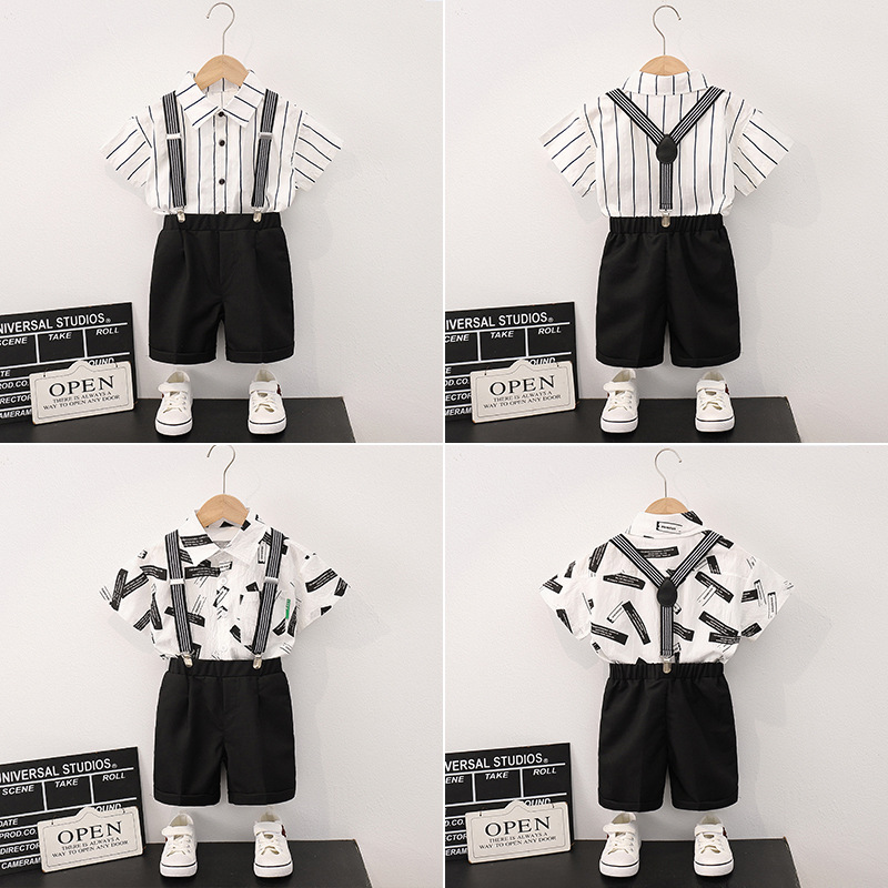 跨境外贸童装男童短袖衬衫背带裤套装新款休闲宝宝花衬衣