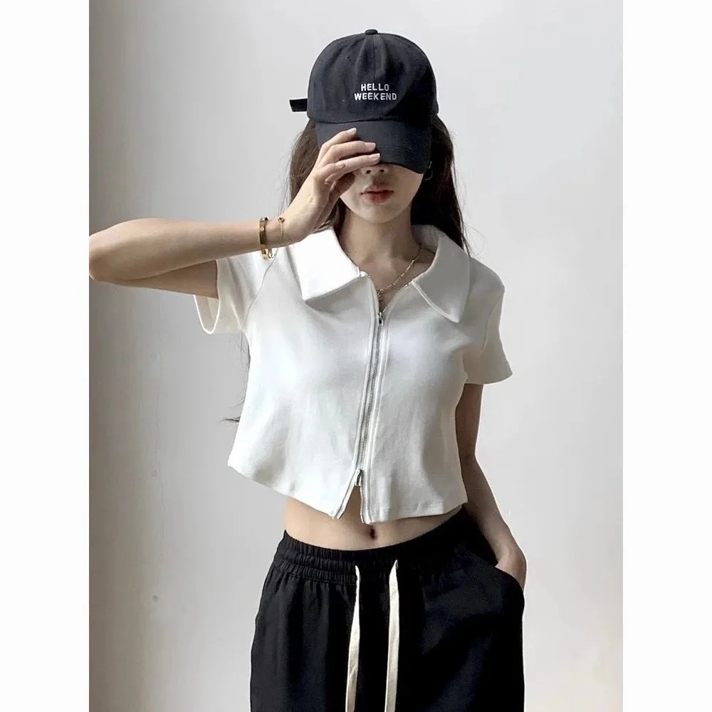 夏季新款白色polo衫短袖t恤女小众双拉链修身显瘦短款上衣潮