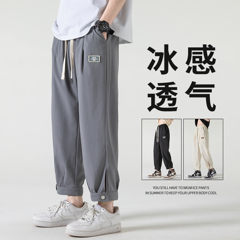 夏季新款冰丝长裤子男生痞帅运动春秋宽松潮流牌男士九分休闲卫裤