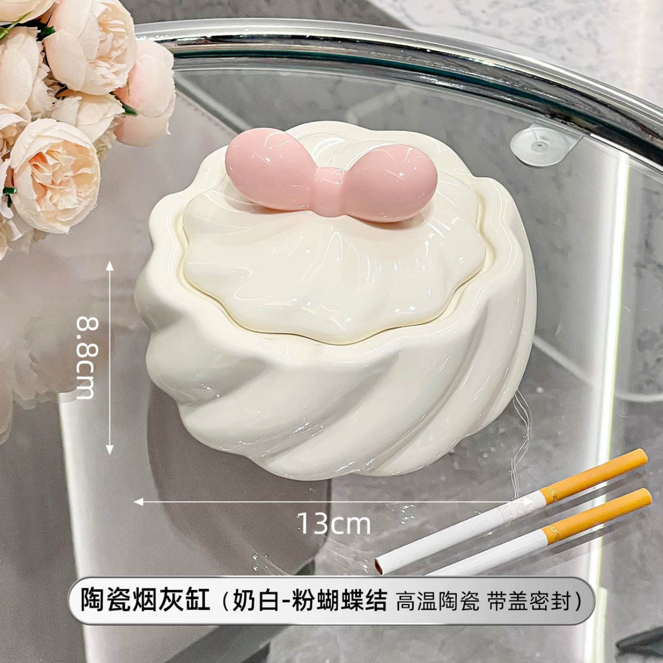 陶瓷奶白烟灰缸+粉蝴蝶结+陶瓷盖子