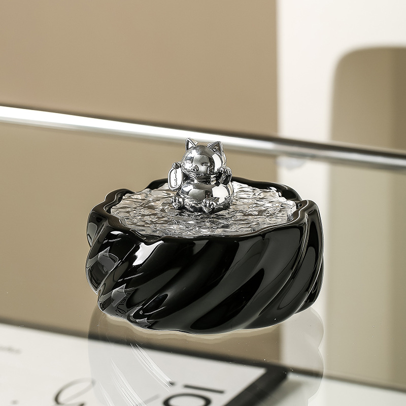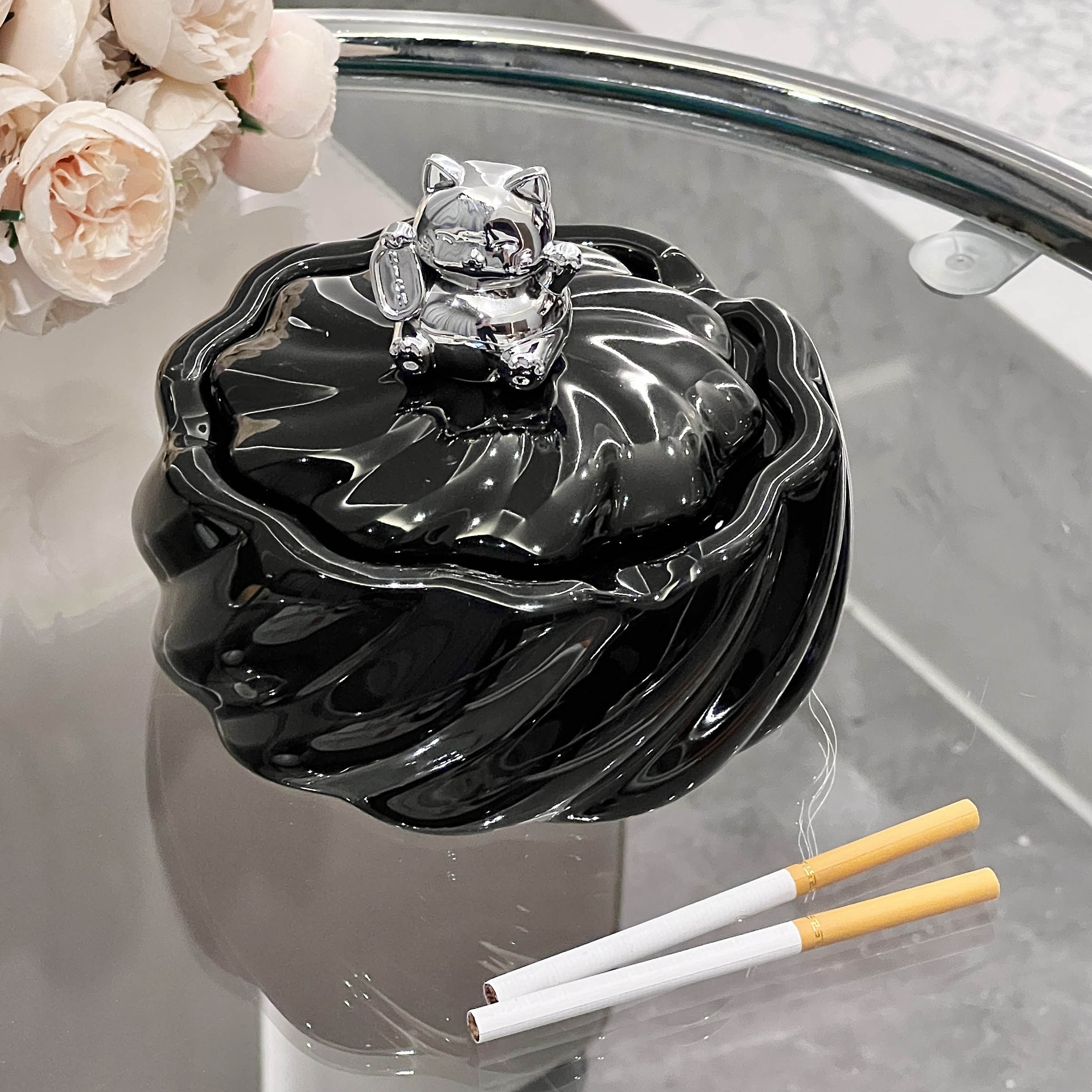 陶瓷黑色烟灰缸+招财猫+亚克力盖子