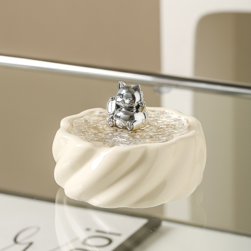 陶瓷奶白烟灰缸+招财猫+陶瓷盖子