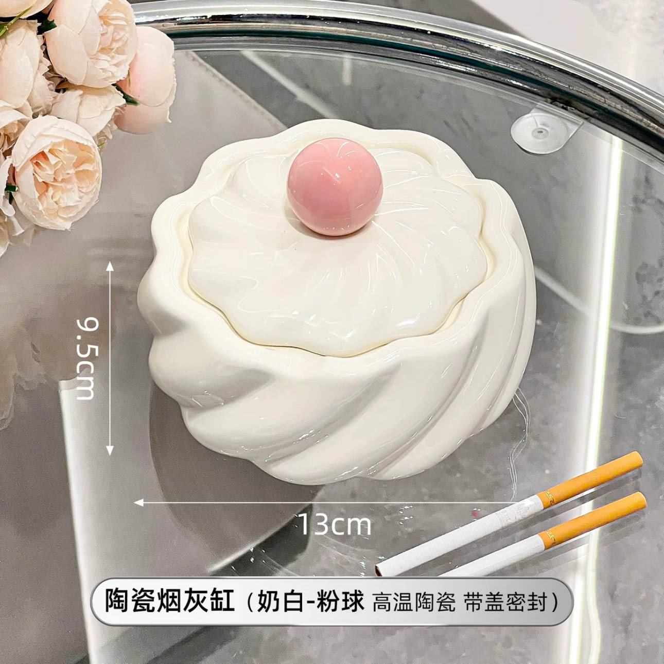 陶瓷奶白烟灰缸+粉球+陶瓷盖子