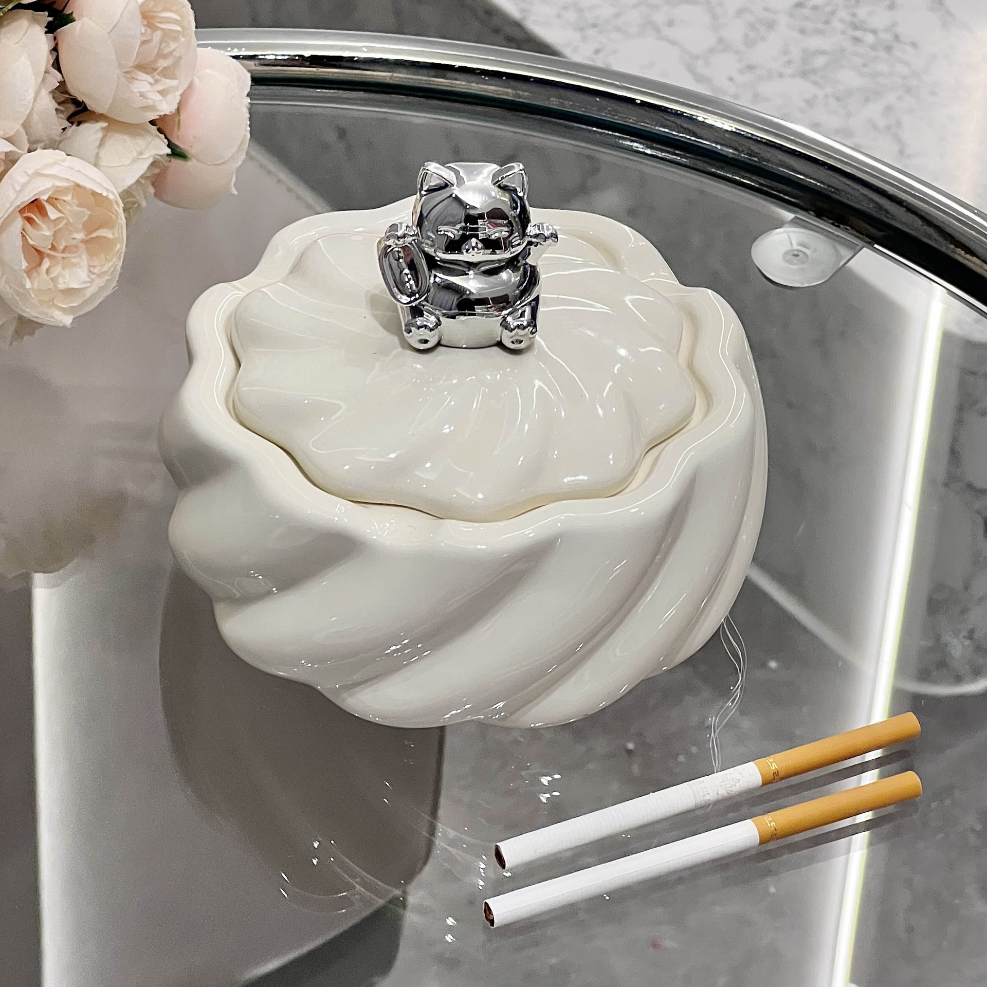 陶瓷奶白烟灰缸+招财猫+亚克力盖子