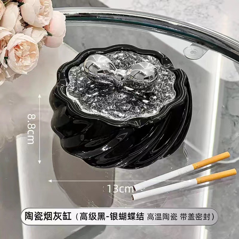 陶瓷黑色烟灰缸+蝴蝶结+亚克力盖子