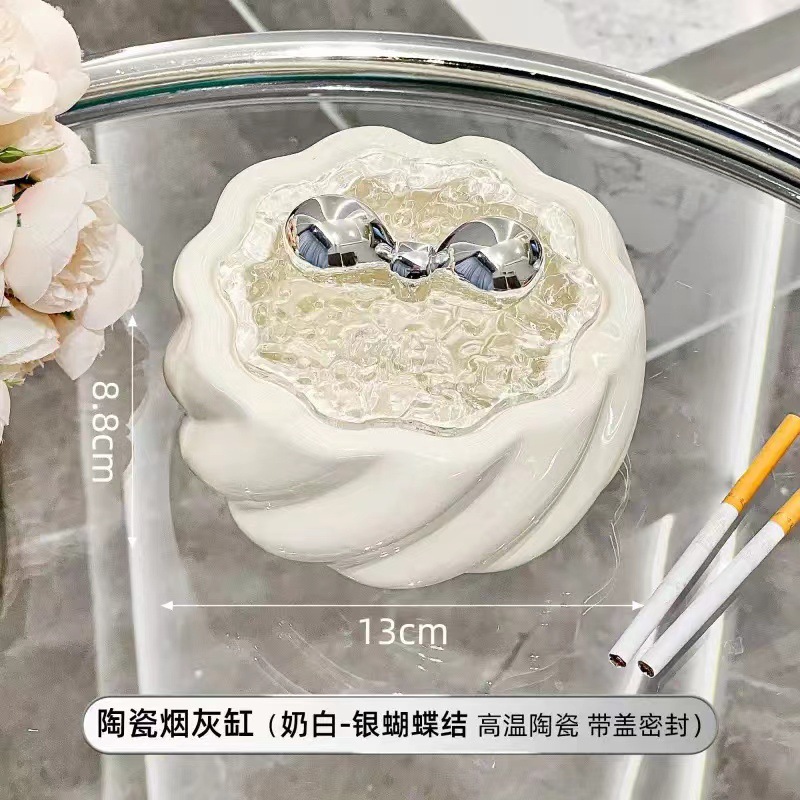 陶瓷奶白烟灰缸+蝴蝶结+亚克力盖子