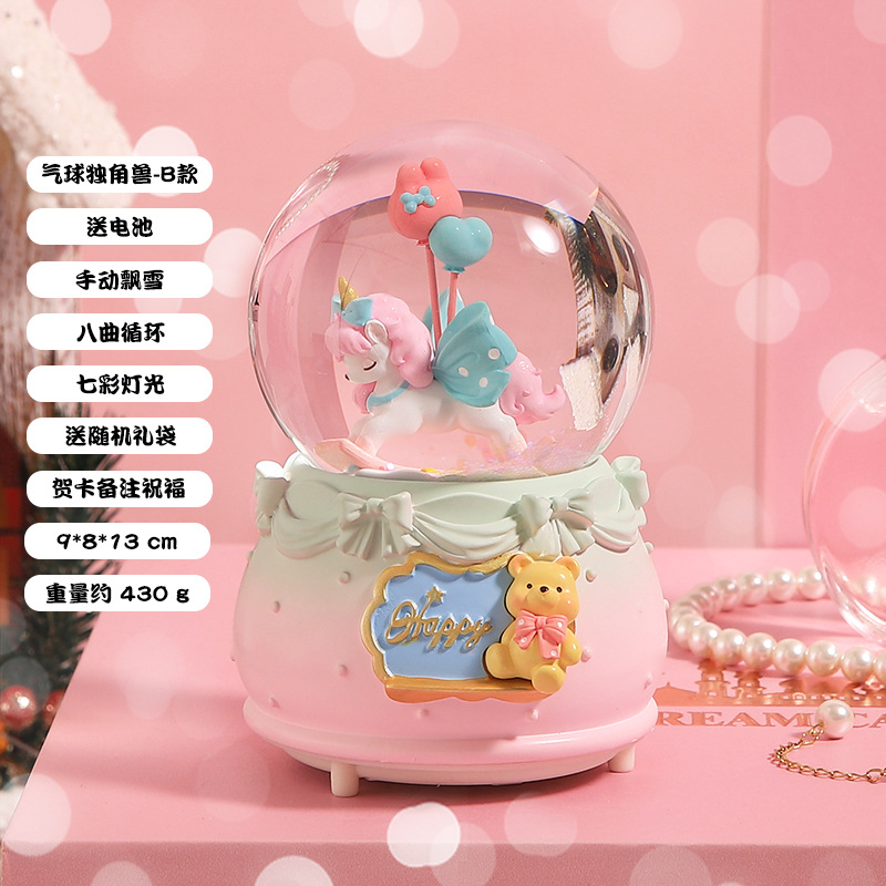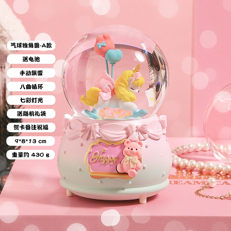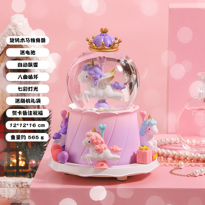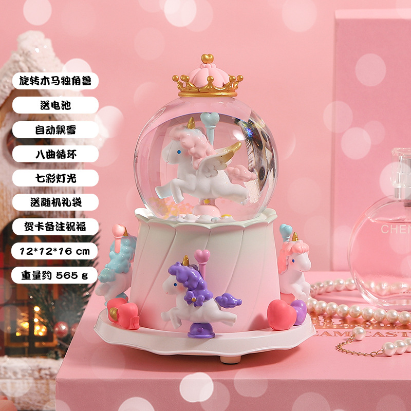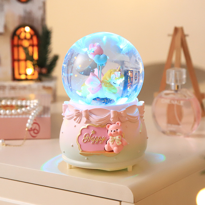 创意节日礼物旋转独角兽水晶球摆件八音盒自动飘雪发光水晶球