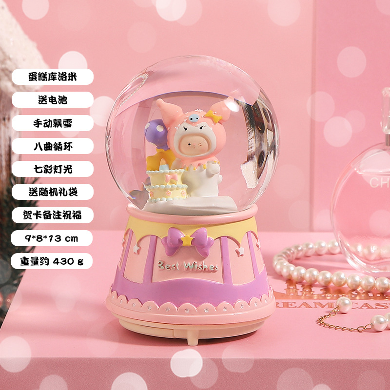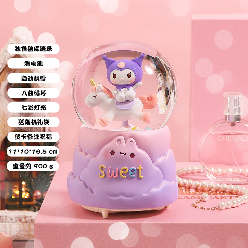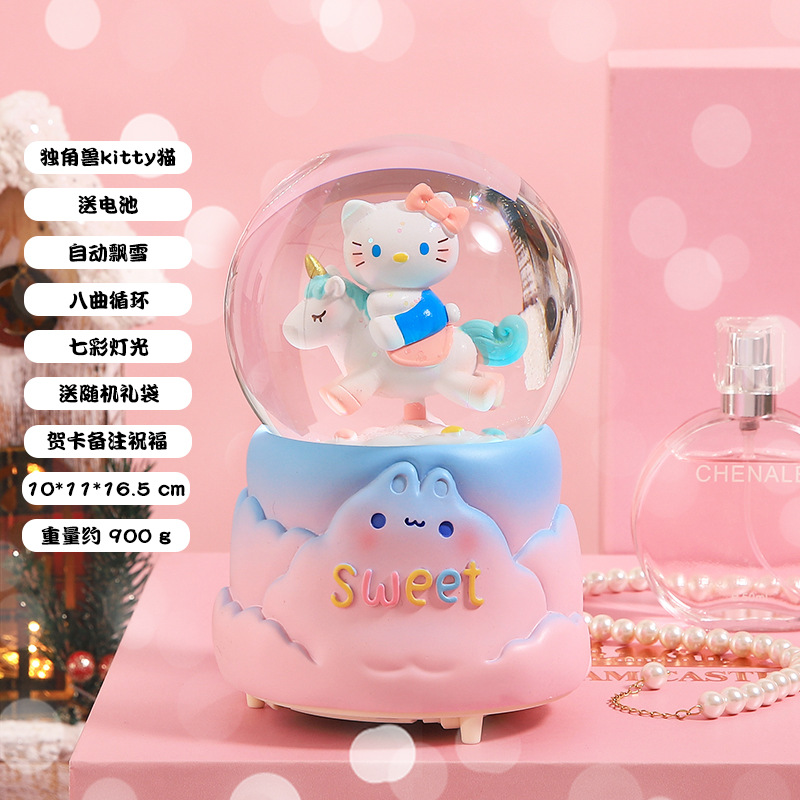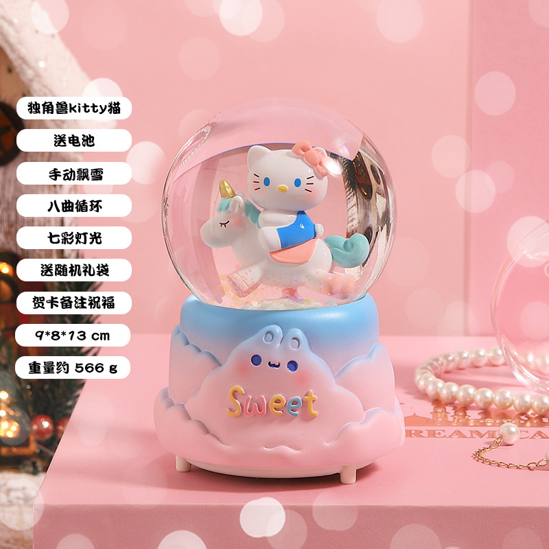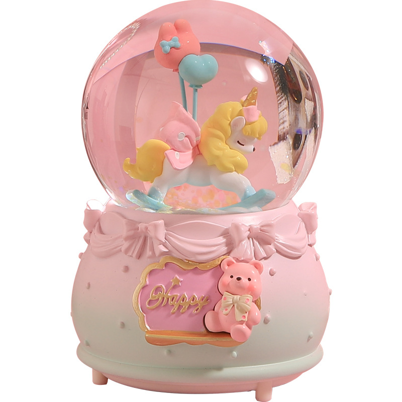 创意节日礼物旋转独角兽水晶球摆件八音盒自动飘雪发光水晶球