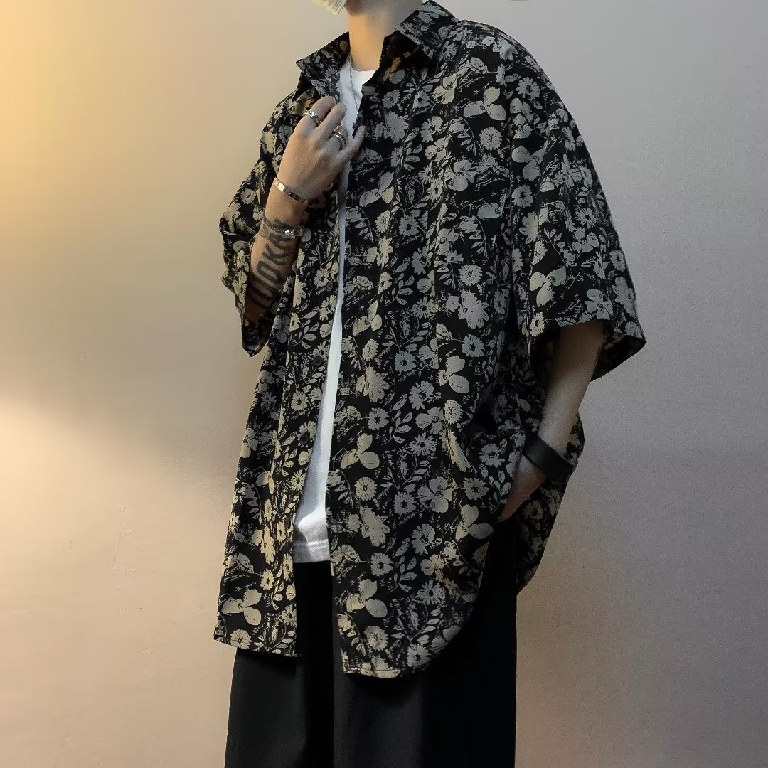 夏季新款宽松复古港味设计感暗黑系小众花衬衫ins痞帅休闲衬衣男