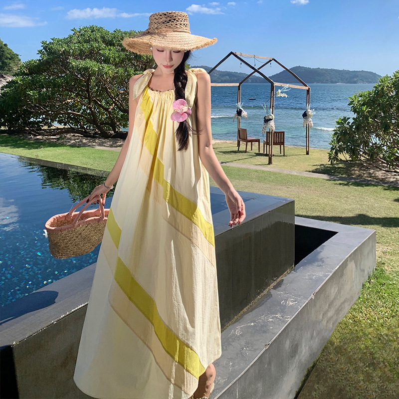 夏季新款设计感小众系带撞色大A摆吊带兔耳度假风宽松连衣裙
