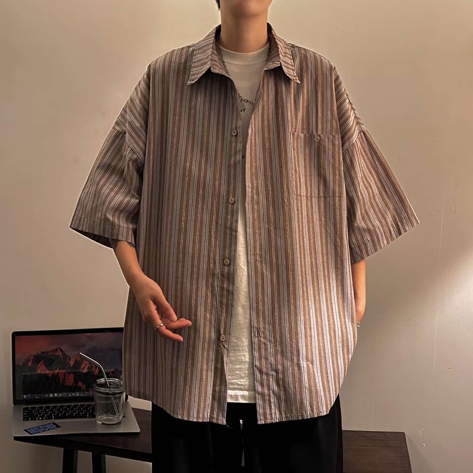 时尚夏季潮潮流衬衫男青春流行慵懒七分袖气质设计感条纹拼色衬衣