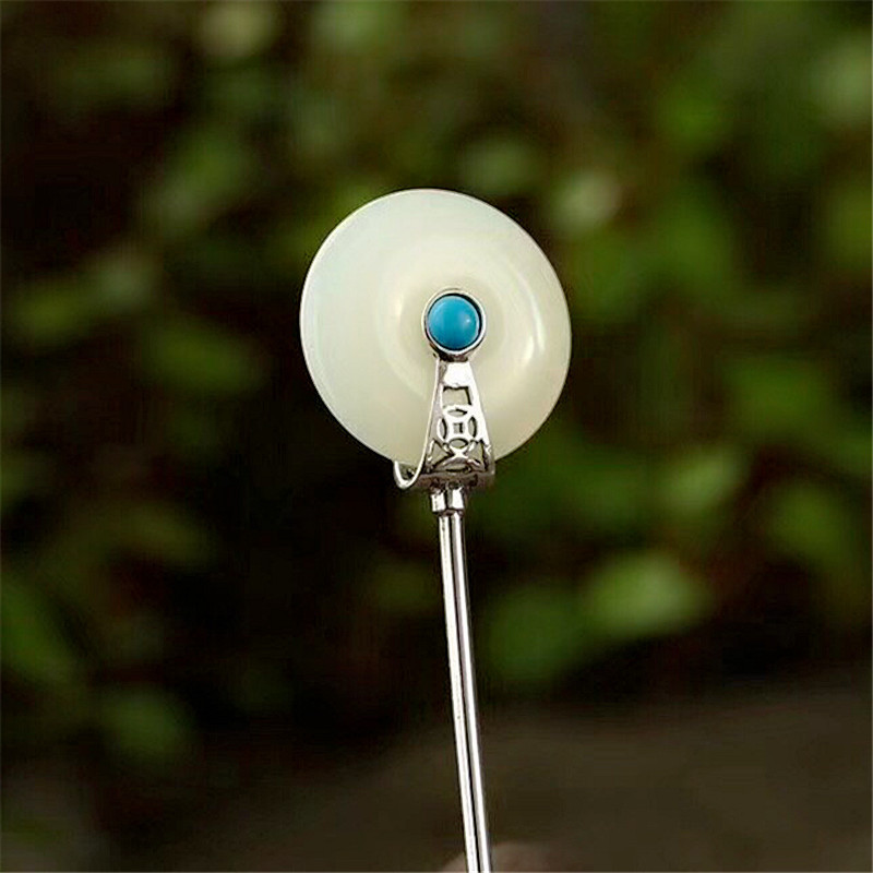 S925纯银镶嵌和田平安扣发簪女士复古风汉服绿松石原创设计簪子