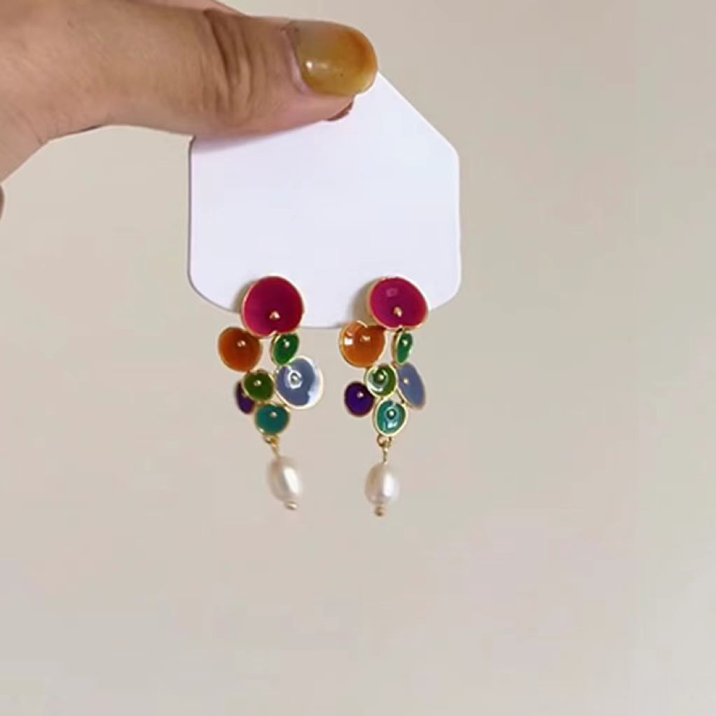 复古珐琅彩色花朵珍珠耳钉简约时尚气质耳环个性新款爆款耳饰
