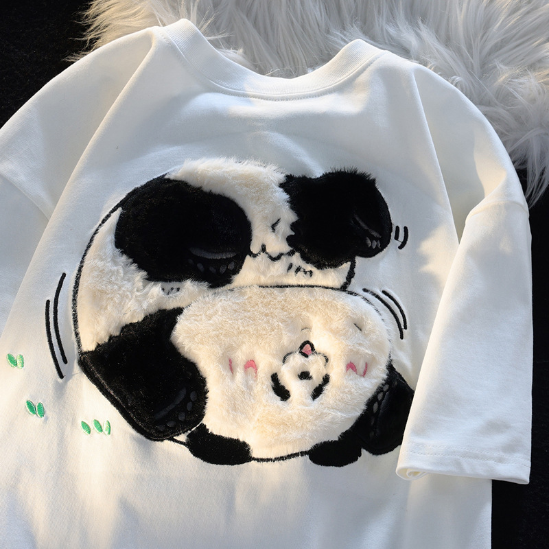 国潮牌oversize植绒可爱熊猫短袖T恤男女小众设计感别致chic情侣