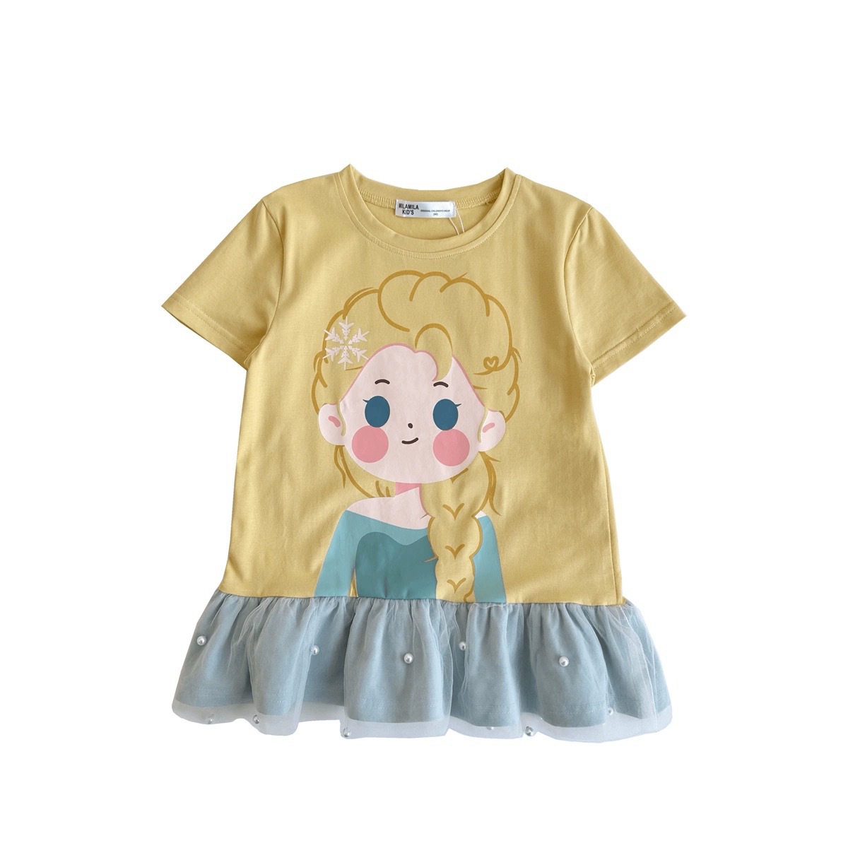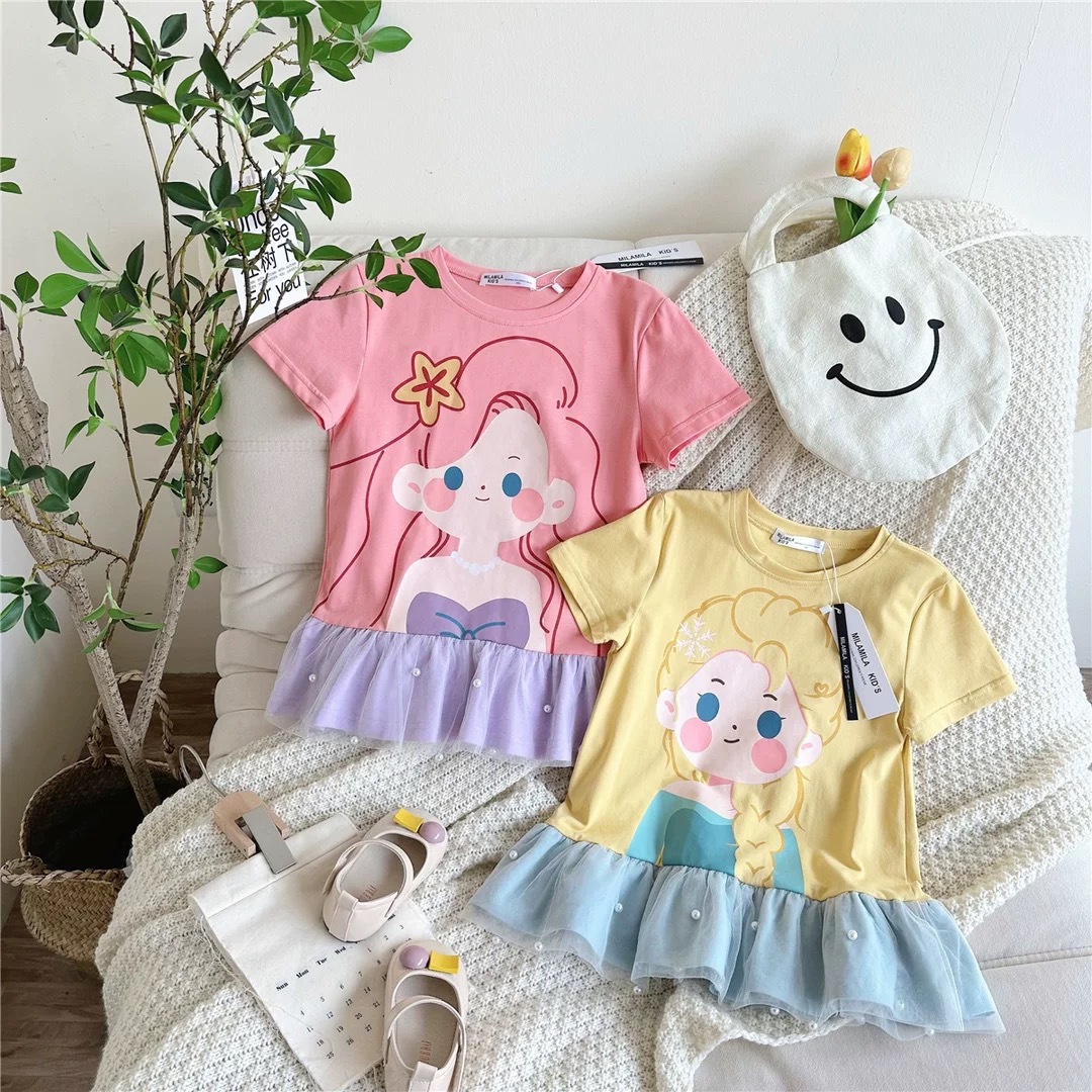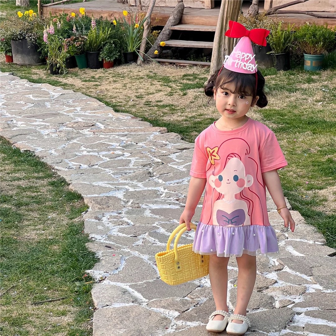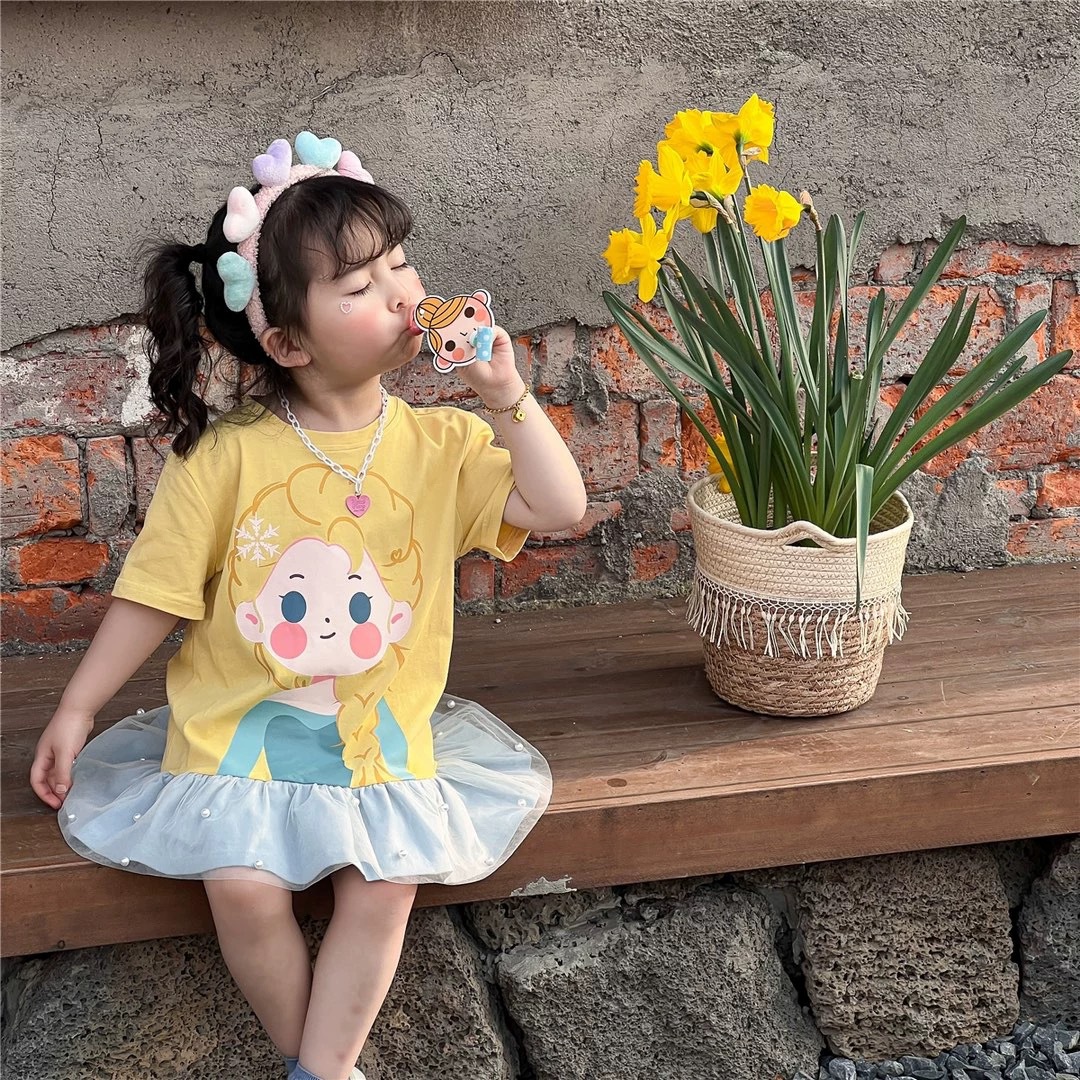 女童拼接网纱连衣裙夏季新款韩版可爱卡通公主系列荷叶边裙女