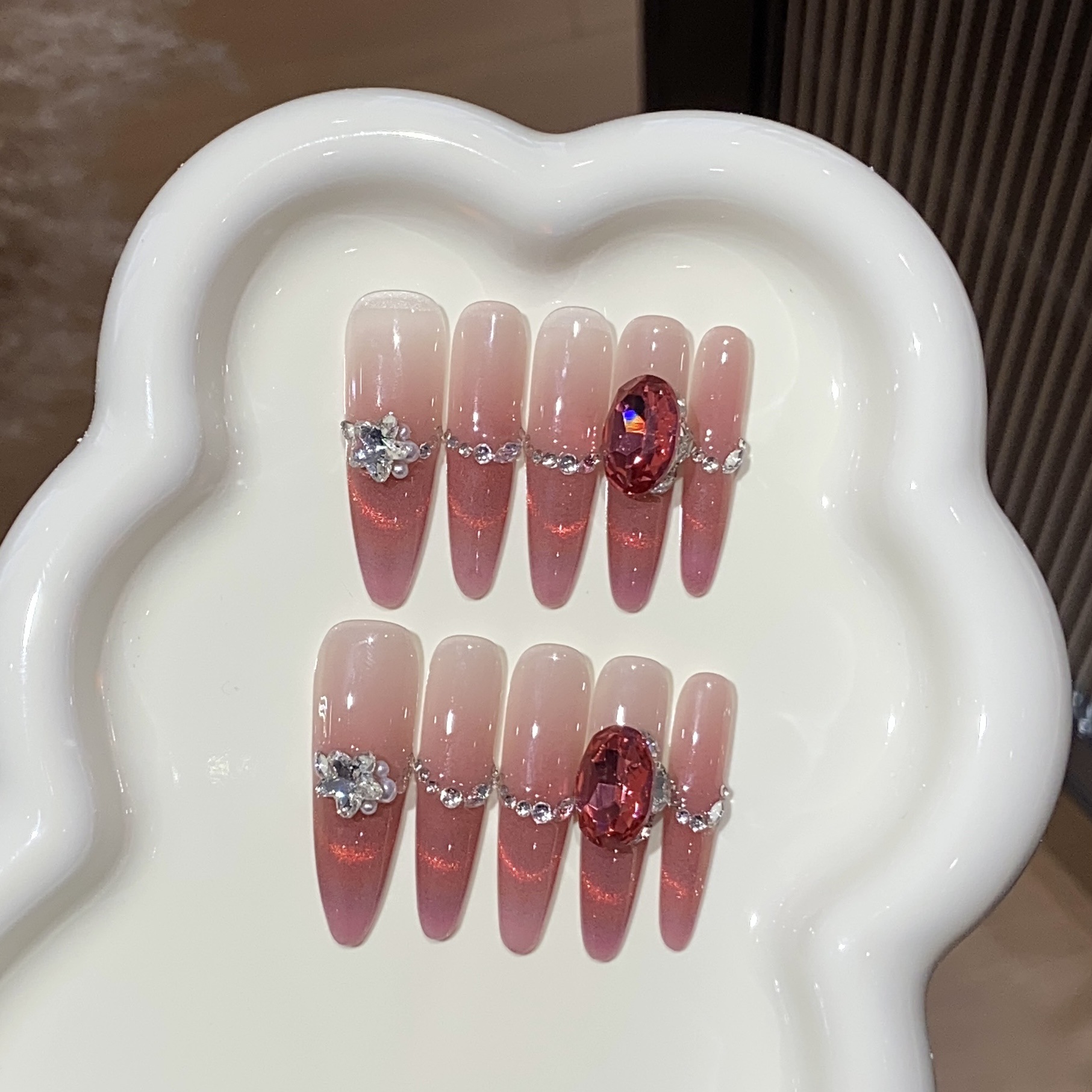 一只顾美甲 冰透粉色渐变极光微笑猫眼粉色椭圆钻草莓甜酒穿戴甲