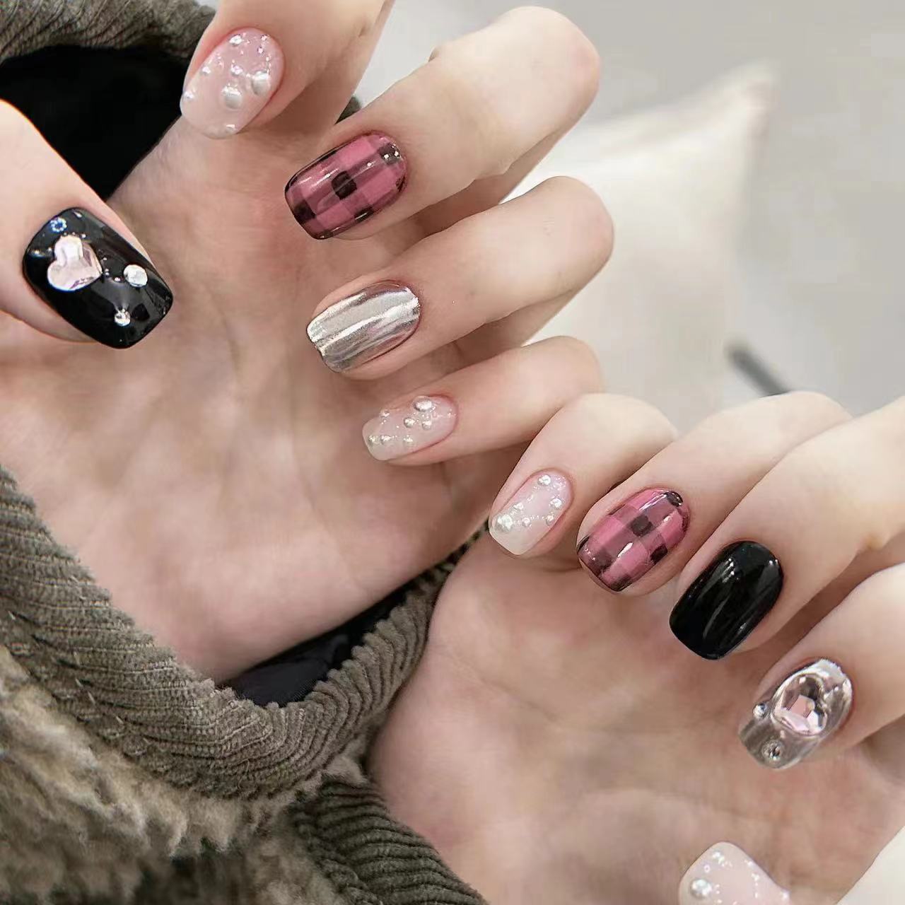 手工穿戴甲y2k甜酷辣妹黑粉手绘格纹美甲成品穿戴式镜面 显白指甲