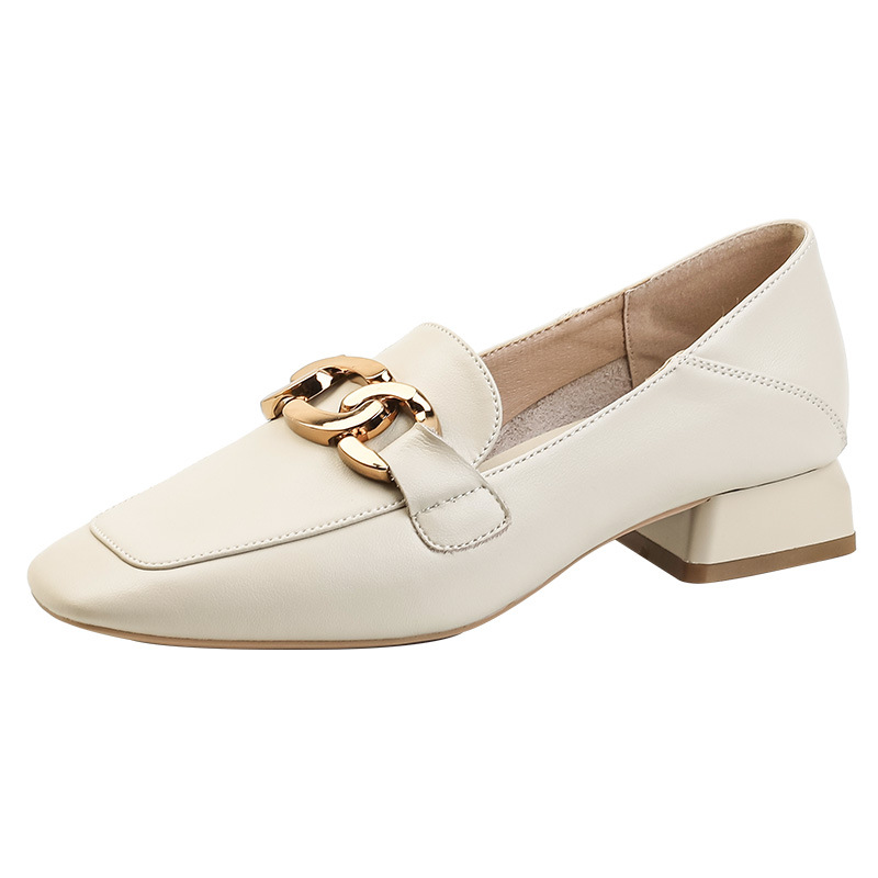大岭鑫宇达~真皮粗跟单鞋女春秋新款方头中跟乐福鞋一脚蹬小皮鞋